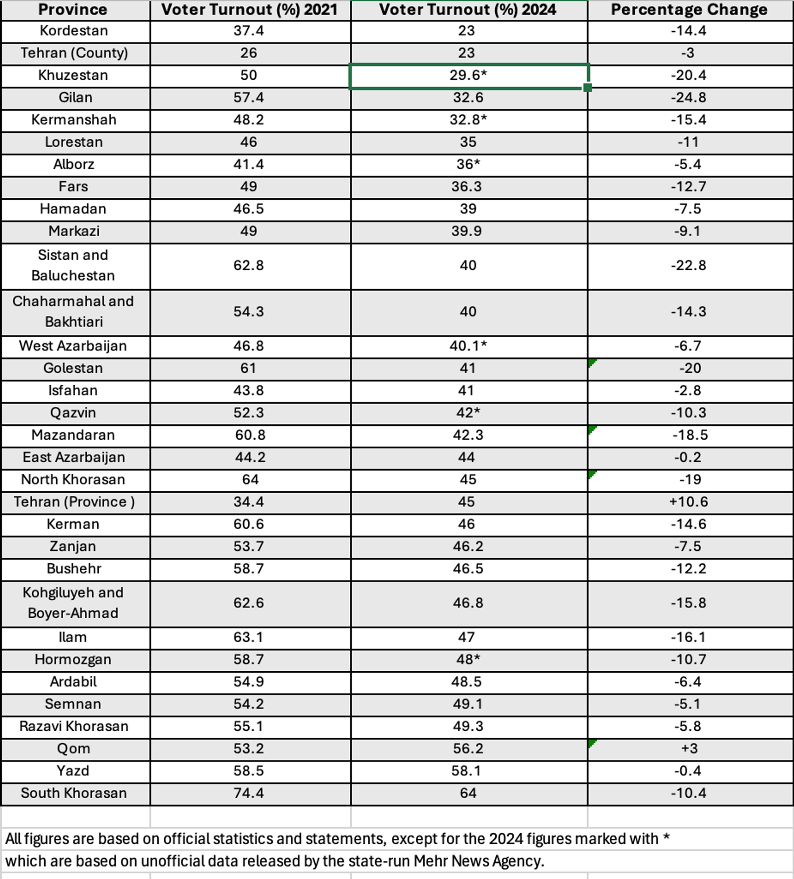 در استان خوزستان نیز که با وجود منابع گسترده انرژی، با معضلات گسترده اقتصادی و بیکاری و بحرانهای زیستمحیطی مواجه است، آمارهای غیر رسمی نشان میدهد که در این دور از انتخابات تنها ۲۹.۶ درصد مردم مشارکت کردند. در انتخابات ۱۴۰۰، آمار رسمی مشارکت مردم خوزستان ۵۰ درصد اعلام شده بود.