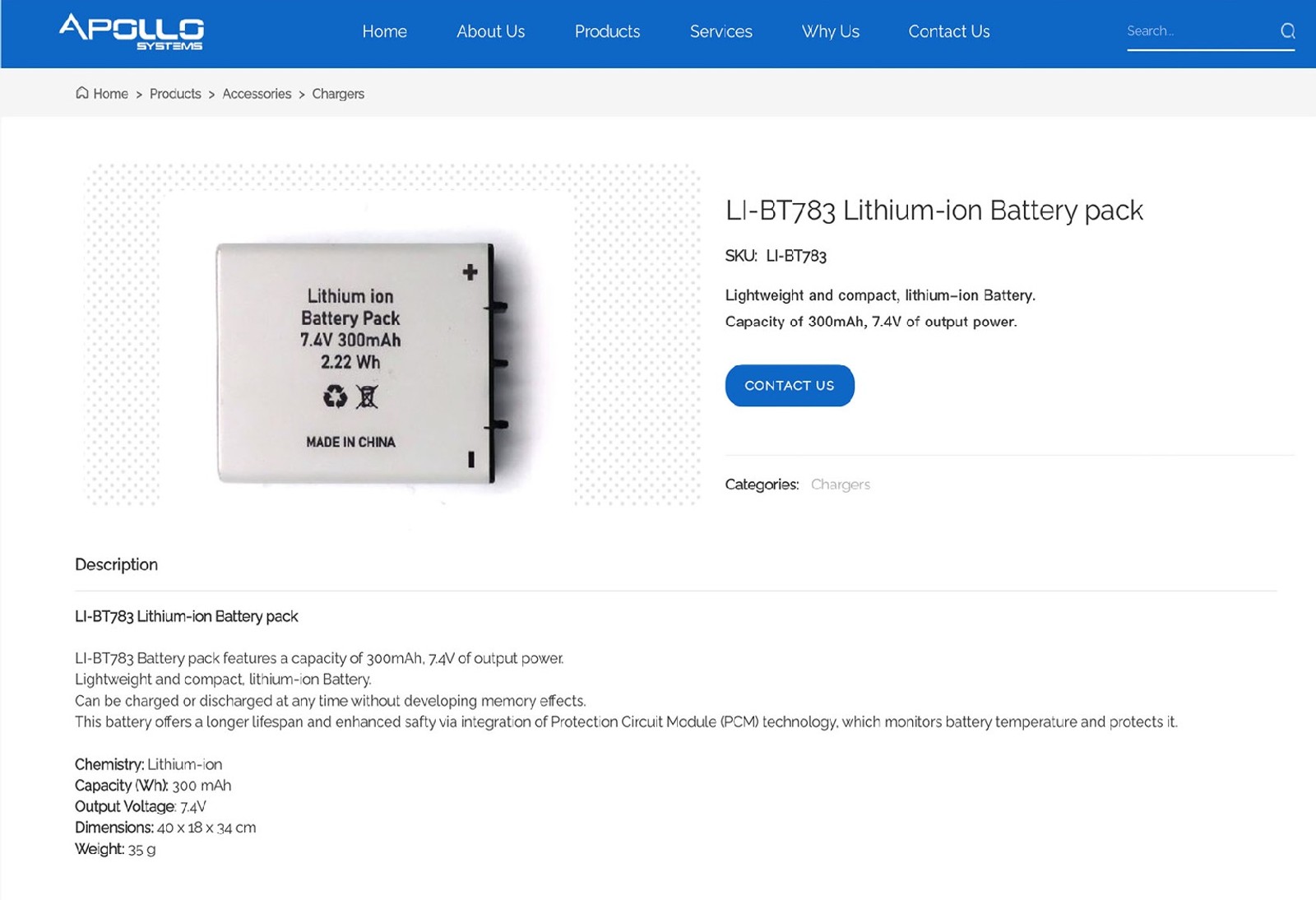بخشی از سایت apollosystemshk.com که به LI-BT783 اختصاص داده شده، بر عملکرد فوقالعاده باتری این شرکت تاکید دارد. در این توضیحات گفته شده بود که بر خلاف باتریهای یک بار مصرف که پیجرهای نسل قدیمی را تغذیه میکردند، این باتری ۸۵ روز عمر دارد و از طریق کابل USB شارژ میشود.