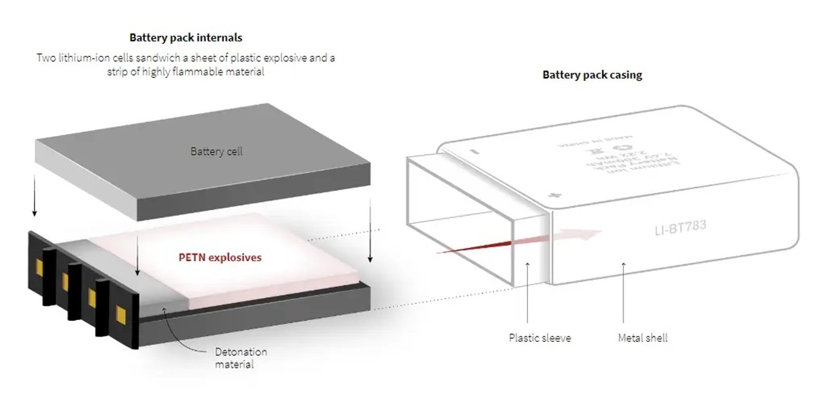 این منبع گفت که فضای باقیمانده بین سلولهای باتری در عکسها دیده نمیشود، اما با نواری از مواد بسیار قابل اشتعالی که به عنوان چاشنی عمل میکردند، جدا شده بود.