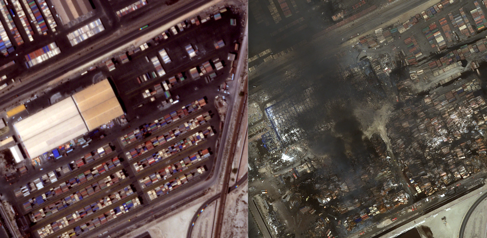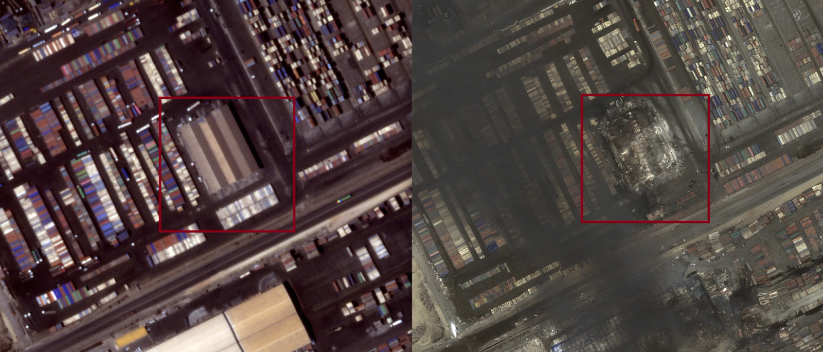 کانون انفجار مقابل ساختمان اداری شرکت توسعه خدمات دریایی و بندری سینا در مقایسه با عکسی که یک ماه قبل از انفجار از محل گرفته شده