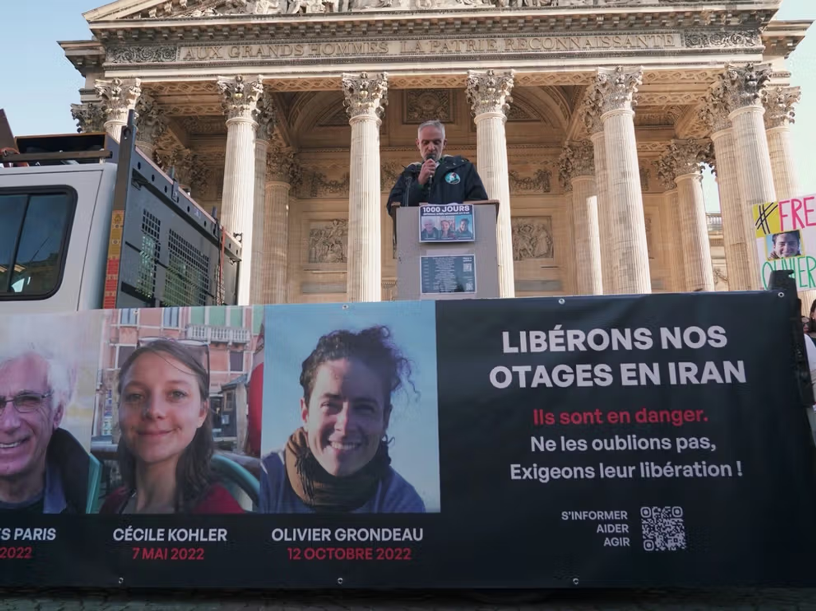 تجمع اعتراضی در واکنش به ادامه بازداشت سه شهروند فرانسوی، از جمله کوهلر و پاریس در ایران/ پاریس، بهمنماه ۱۴۰۳