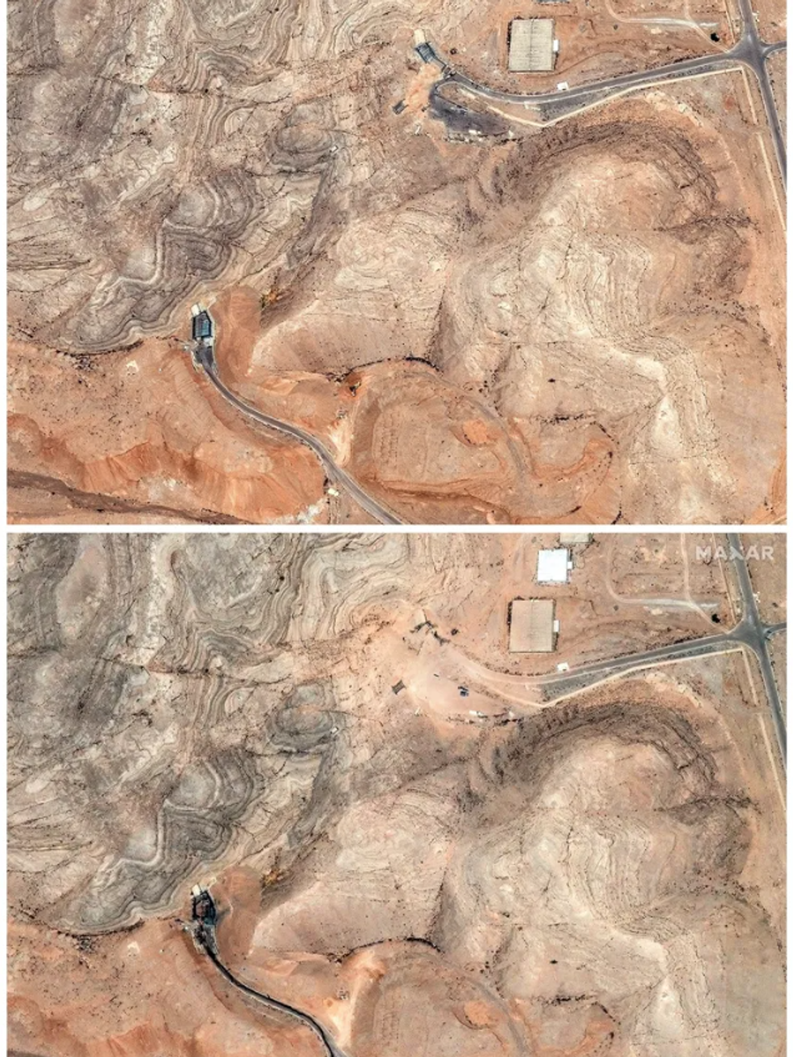 نمایی از ورودی تونل‌های مرکز تحقیقات فناوری هسته‌ای اصفهان پیش و پس از حملات هوایی آمریکا؛ ۳۰ خرداد (بالا) و اول تیر ۱۴۰۴ (پایین)