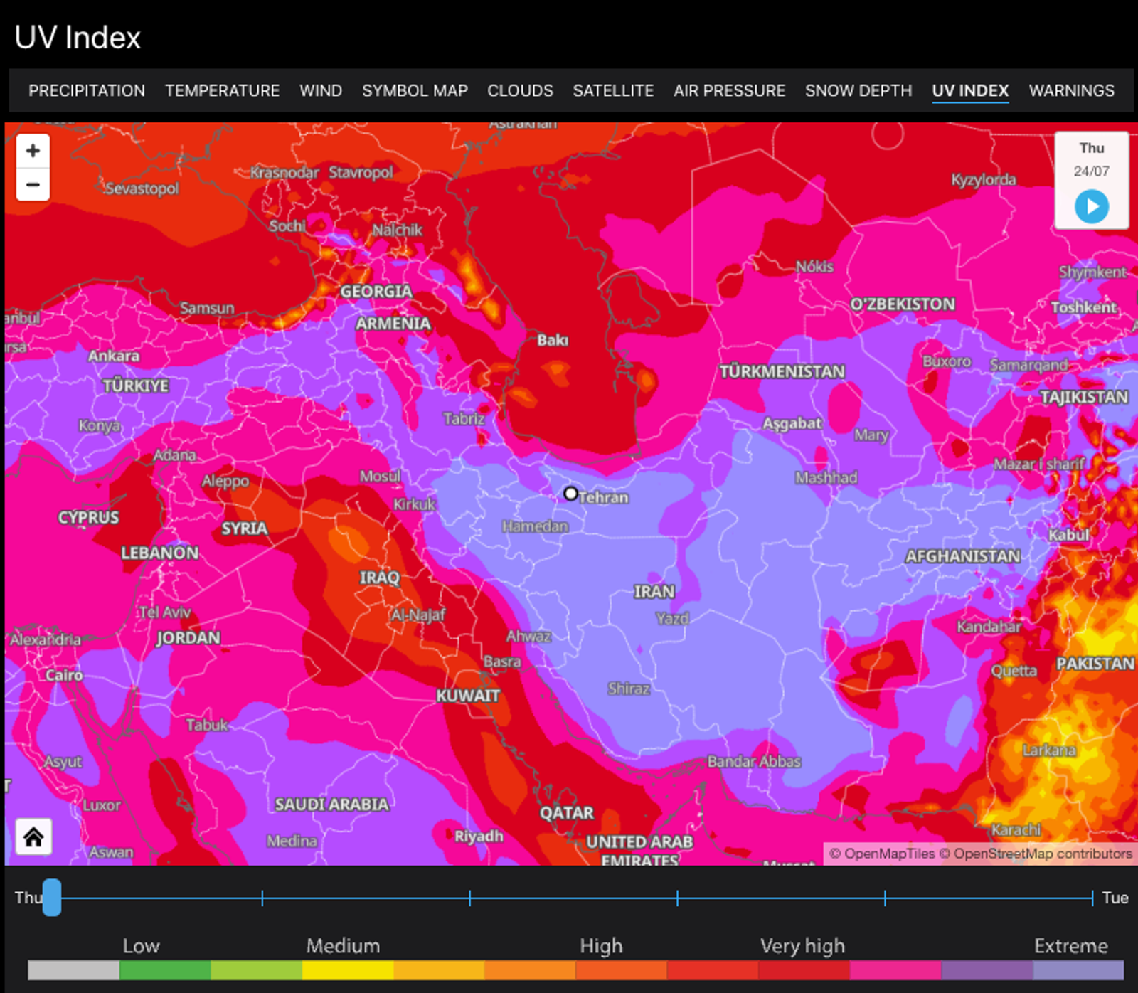 بررسی دادههای مربوط به شهر تهران در پایگاههای بینالمللی هواشناسی نشان میدهد شاخص فرابنفش پایتخت ایران در ماههای خرداد و تیر گاه به ۱۲ و یا بیشتر از آن نیز رسیده است.