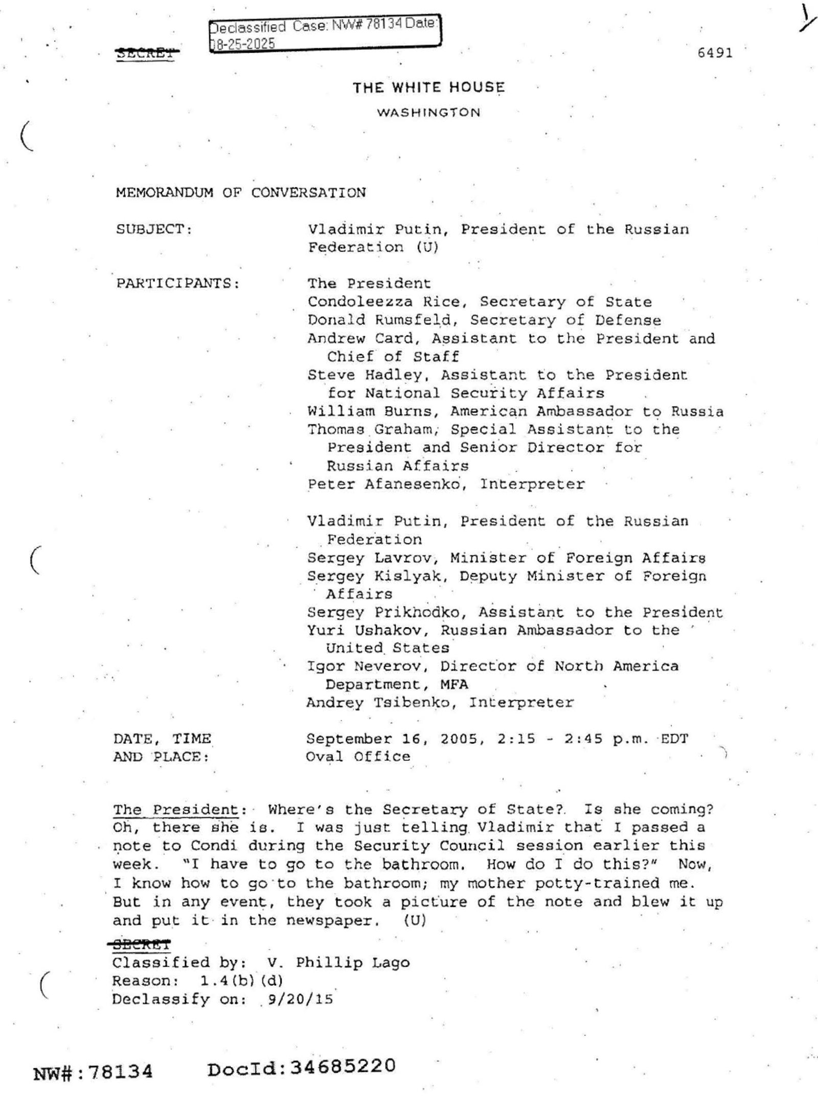 وفي وثيقة أخرى تتعلق بلقاء جمع بوتين وبوش في 16 سبتمبر (أيلول) 2005 داخل المكتب الرئاسي في البيت الأبيض، عاد تركيز المحادثات مرة أخرى إلى مسألة عدم انتشار الأسلحة النووية والتعاون بين الولايات المتحدة وروسيا بشأن إيران. ووفقًا لنص الوثيقة، قدّم بوتين شرحًا مفصلاً لفهم روسيا لطبيعة البرنامج النووي الإيراني، ولمخاوف موسكو، وللأسباب التي دفعت روسيا إلى المشاركة في مشروع محطة بوشهر النووية.