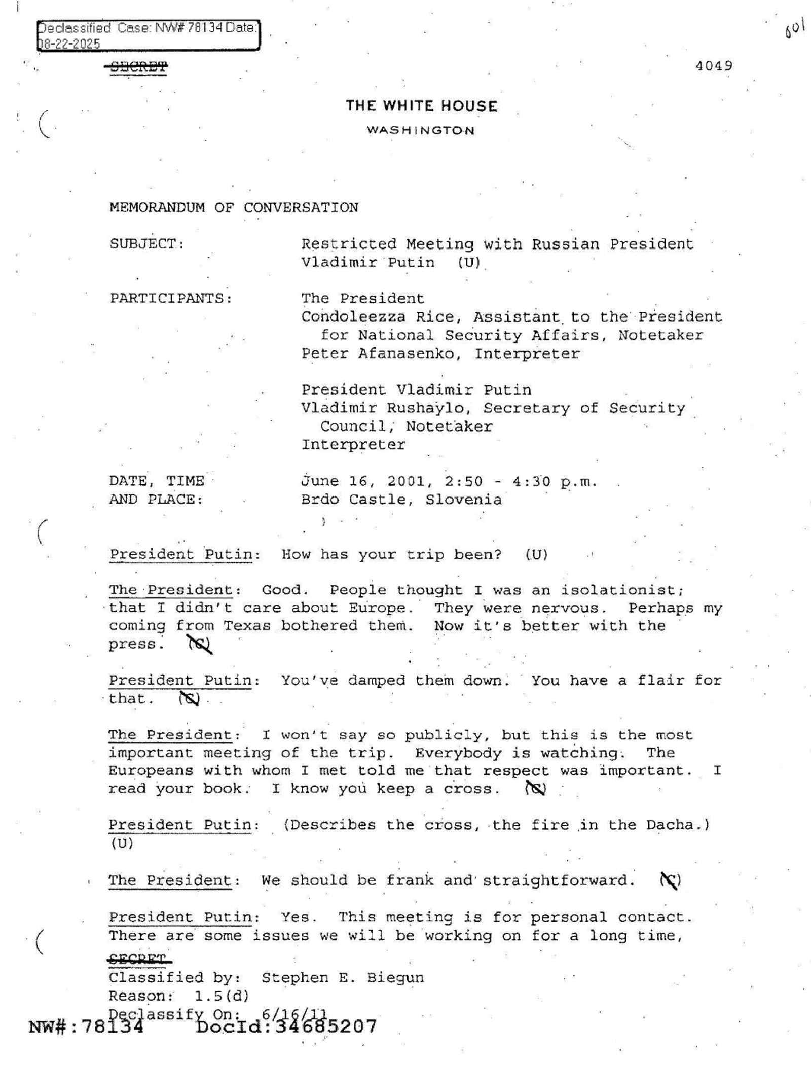 وفي واحدة من أهم هذه الوثائق، والمتعلقة بلقاء عُقد في 16 يونيو (حزيران) 2001 في سلوفينيا، قال بوتين مخاطبًا بوش: "الخبراء الإيرانيون يطرحون الكثير من الأسئلة حول قضايا حساسة على خبرائنا. لا شك في أنهم يريدون امتلاك سلاح نووي. وقد أبلغتُ أفرادنا بعدم تزويدهم بمثل هذه المعلومات".