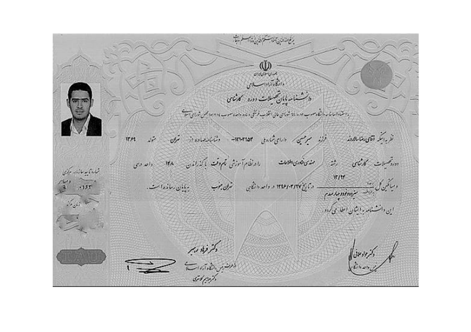 The 30-year-old with a bachelor’s degree in information technology engineering from the South Branch of Tehran’s Azad University with a lower-than-average grade of 13, according to his BS certificate, which was also released by Lab-Doukhtegan.