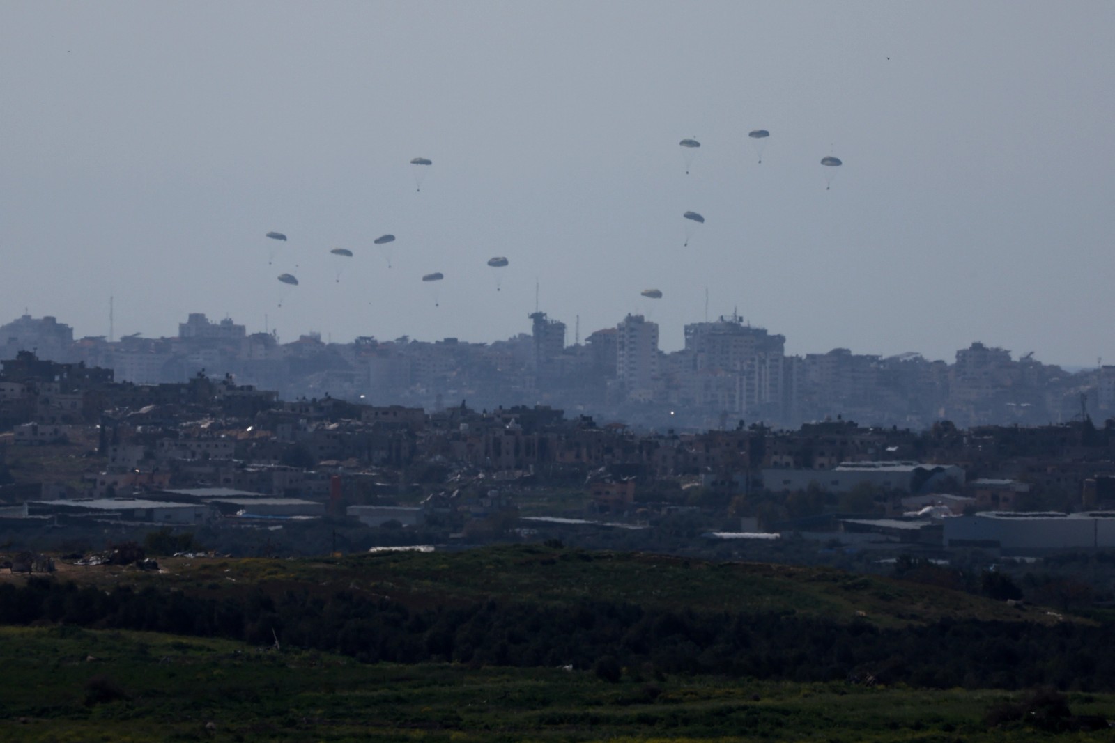 Packages fall towards northern Gaza, after being dropped from a military aircraft, amid the ongoing conflict between Israel and the Palestinian group Hamas, as seen from Israel's border with Gaza, in southern Israel, March 11, 2024.