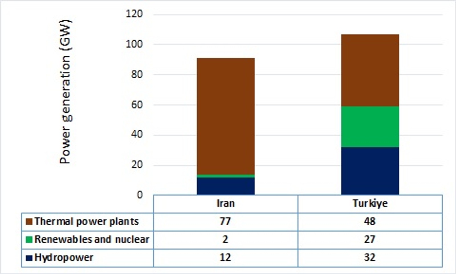 Currently, renewables (solar, wind, biomass, geothermal) and hydropower collectively account for approximately 59% of Turkey's nominal power generation capacity. In contrast, in Iran, this figure stands at about 15%.