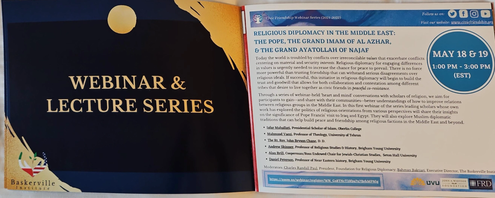 In addition to Baskerville, the conference program listed the following organizations as sponsors: the US-based Stirling Foundation, the Foundation for Religious Diplomacy, the Utah Muslim Civic League, the Arab Center for Research and Policy Studies in Doha, Qatar, and the International Center for Law and Religion at Brigham Young University.