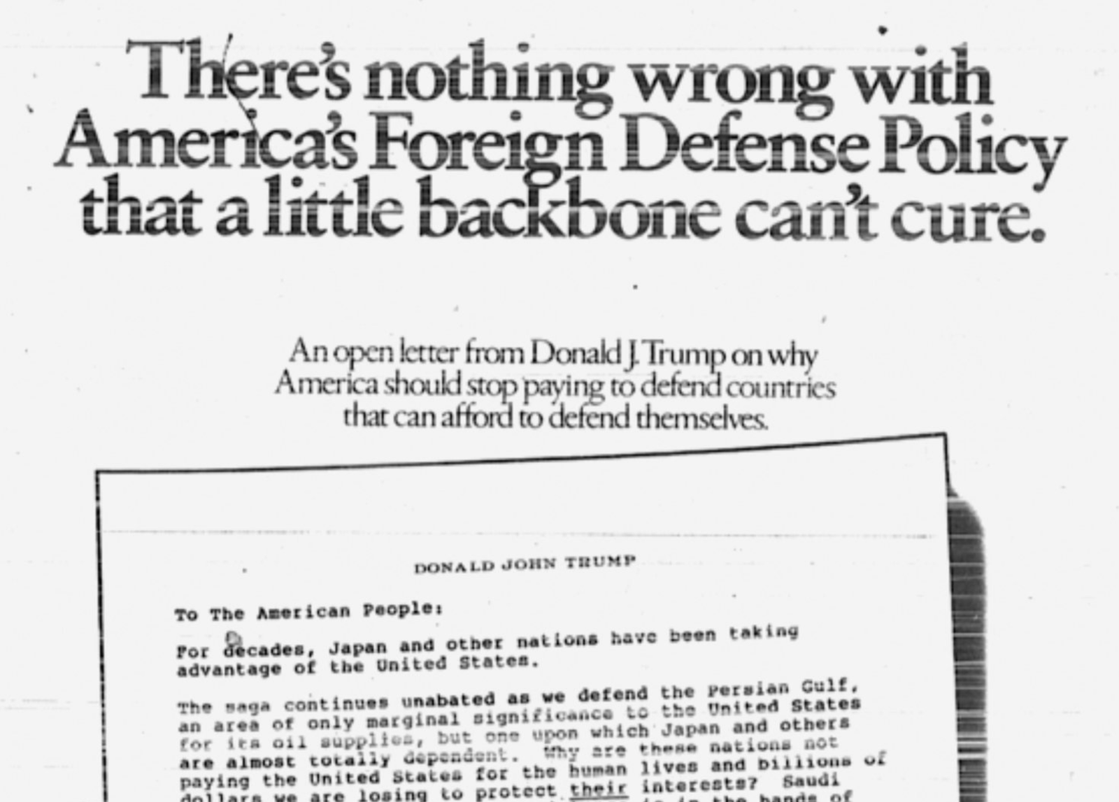 An image of Trump's open letter criticizing US foreign policy in 1987