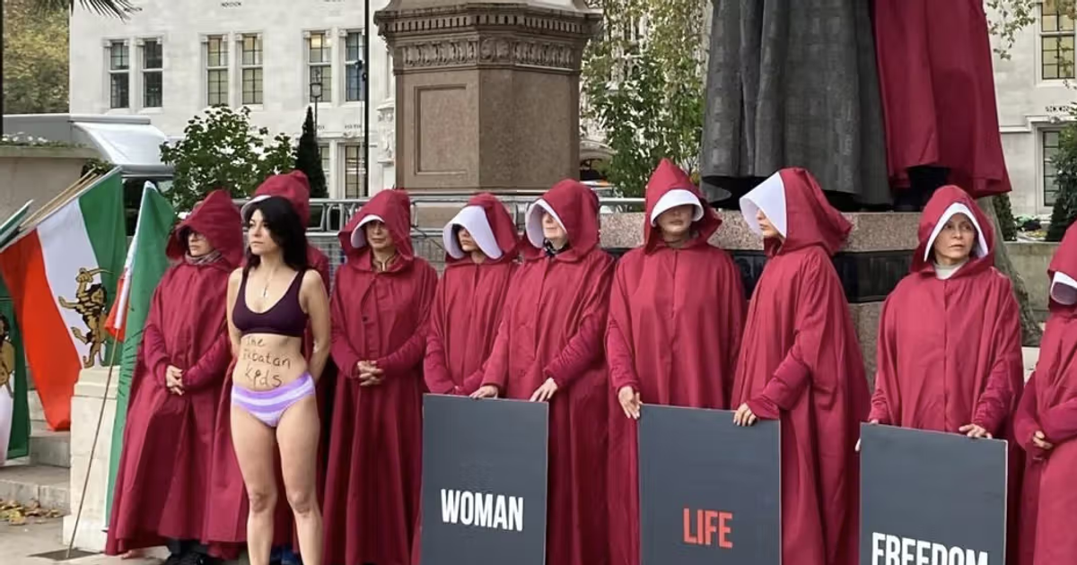 Women in central London gathered to support the victims of Iran’s mandatory hijab policies, demonstrating in costumes from The Handmaid’s Tale on Nov. 8, 2024