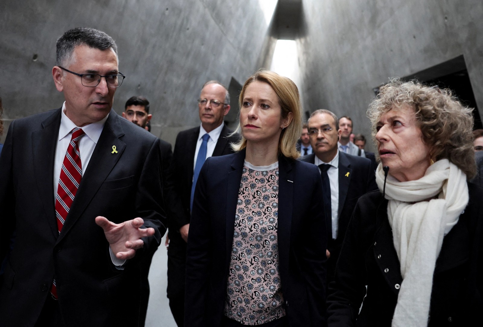 High Representative for Foreign Affairs and Security Policy, and Vice-President of the European Commission Kaja Kallas walks next to Israeli Foreign Minister Gideon Saar, as she visits Yad Vashem, the World Holocaust Remembrance Center, in Jerusalem, March 24, 2025.