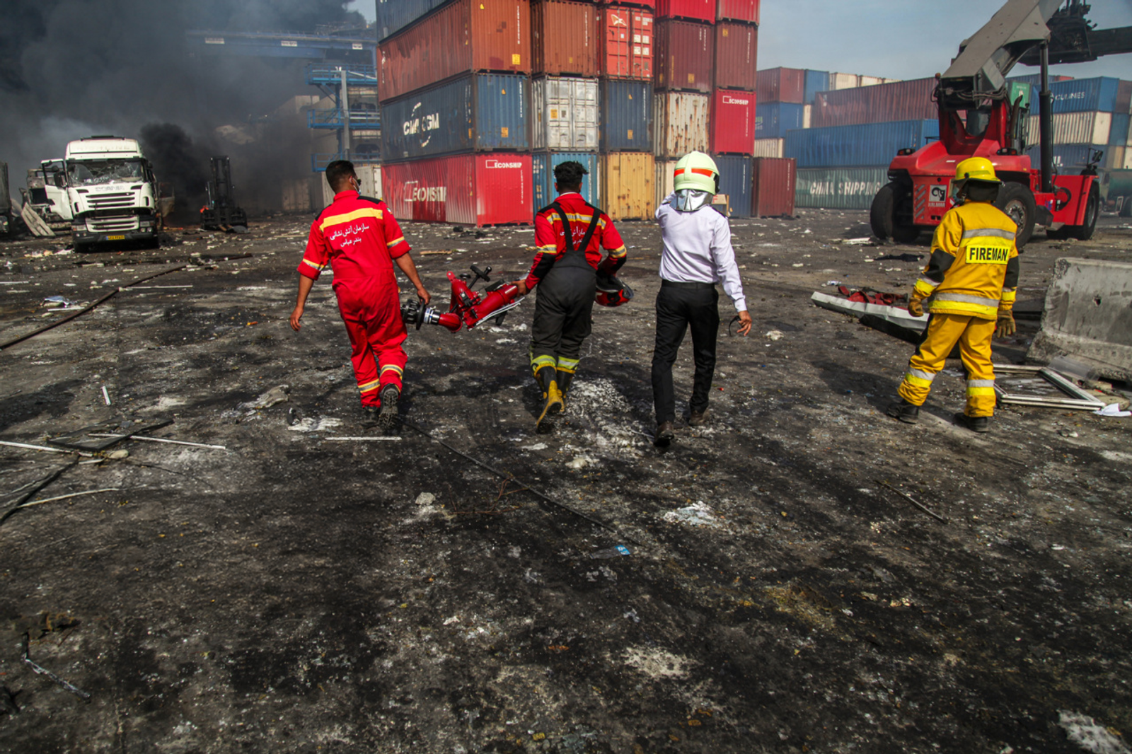 Firefighters respond to an explosion at Shahid Rajaee Port in Bandar Abbas, Iran.