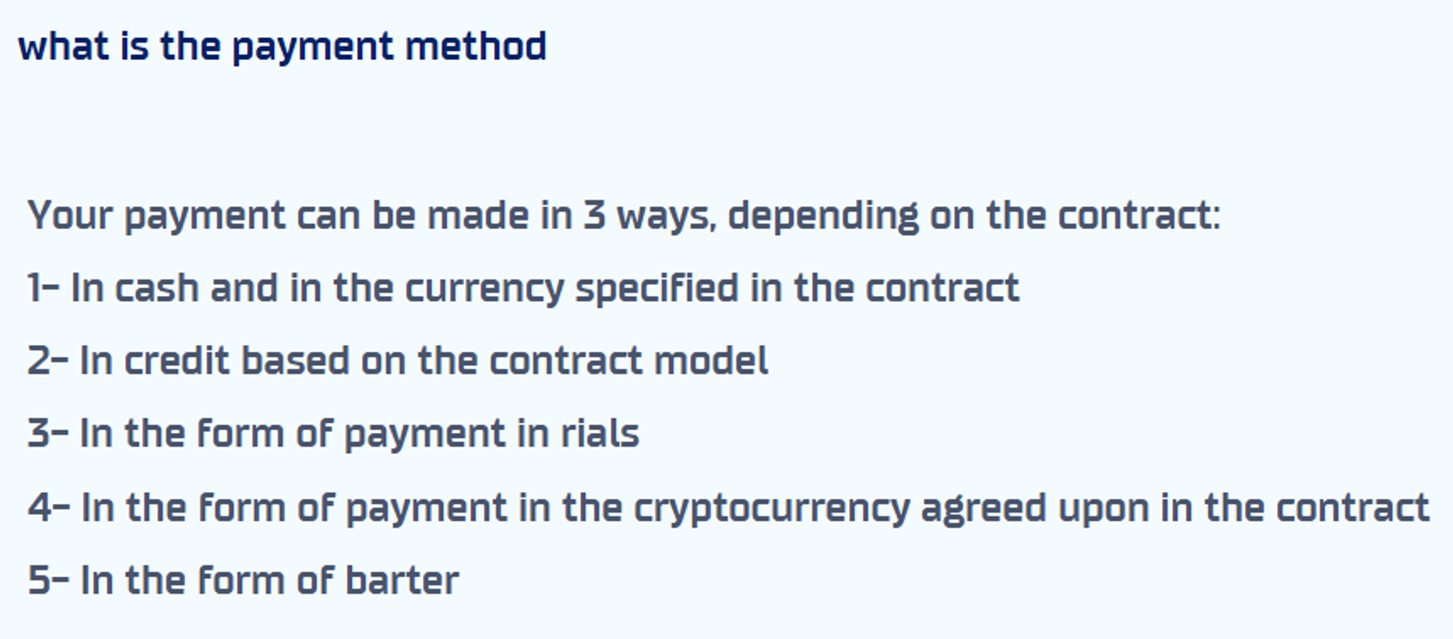 The portal’s payment terms say contracts can be settled using “digital currencies,” local currencies in the buyer’s country and barter arrangements, alongside more traditional bank transfers.