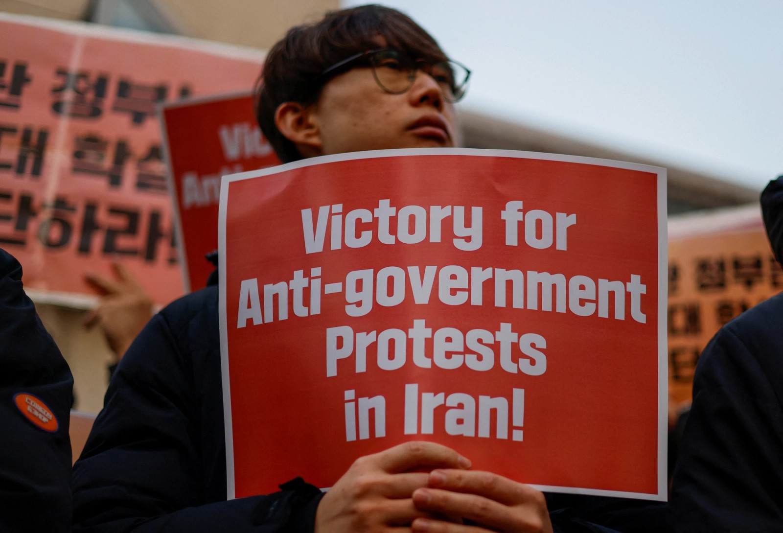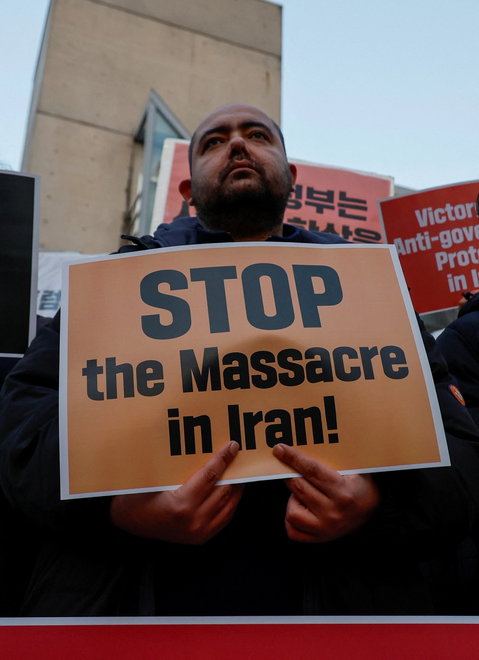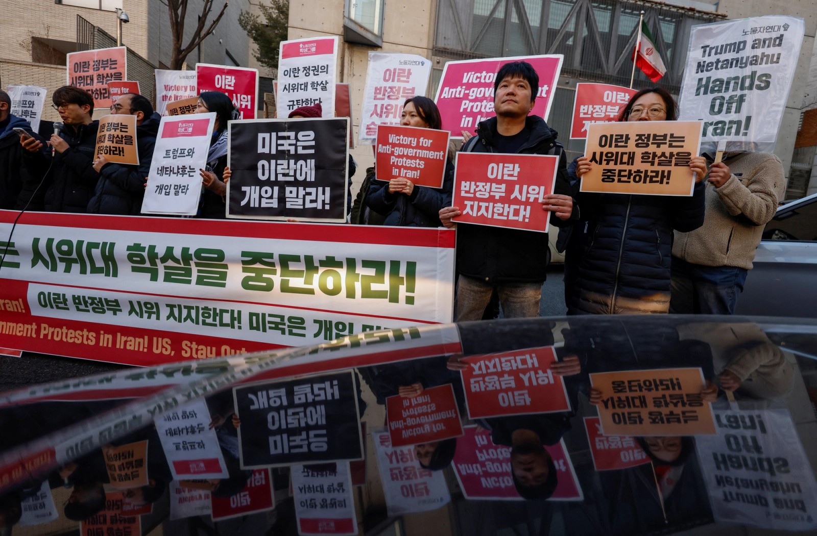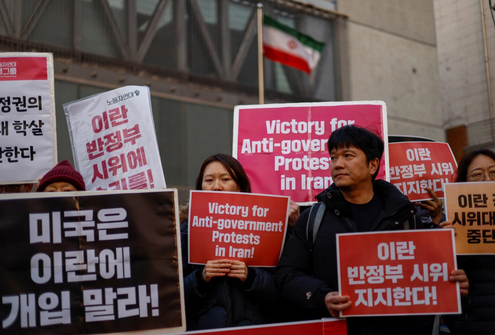 Activists rallied outside the Iranian embassy in Seoul on Friday, holding placards in support of anti-government protests in Iran and calling for an end to the killing of demonstrators.