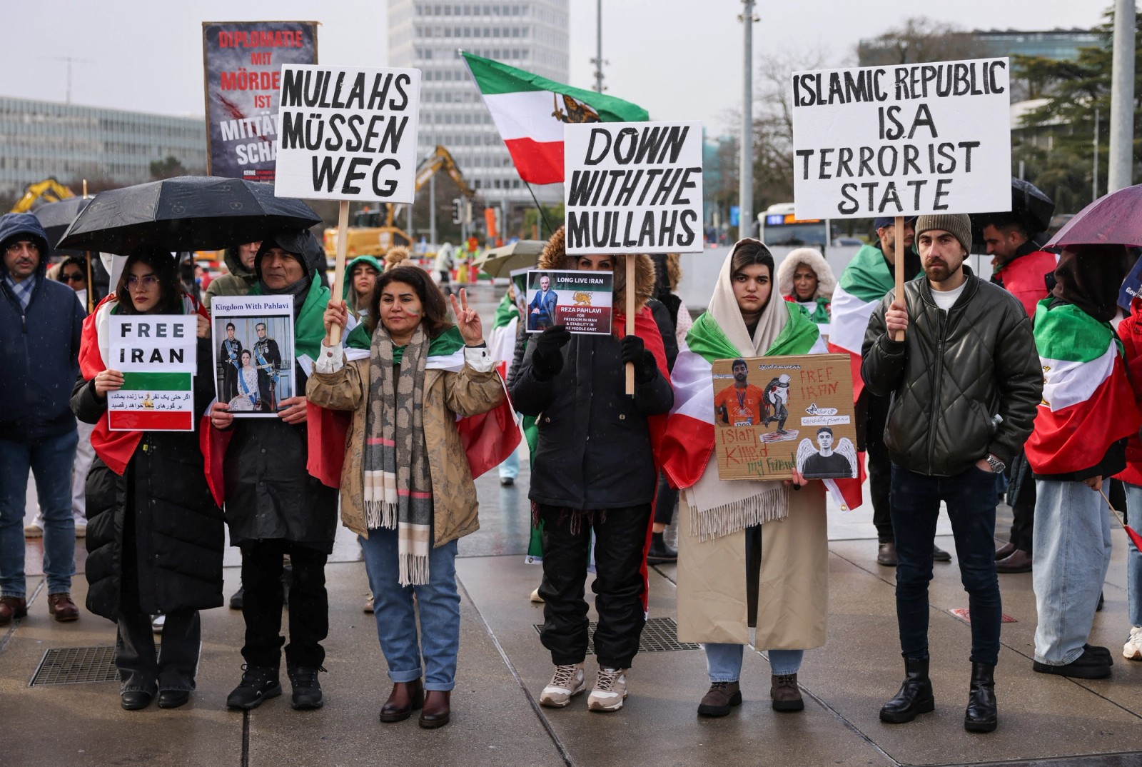 People carrying Iran’s pre-1979 “Lion and Sun” national flags gathered near the United Nations office in Geneva on Tuesday as a second round of nuclear talks between the United States and Iran took place in the city.