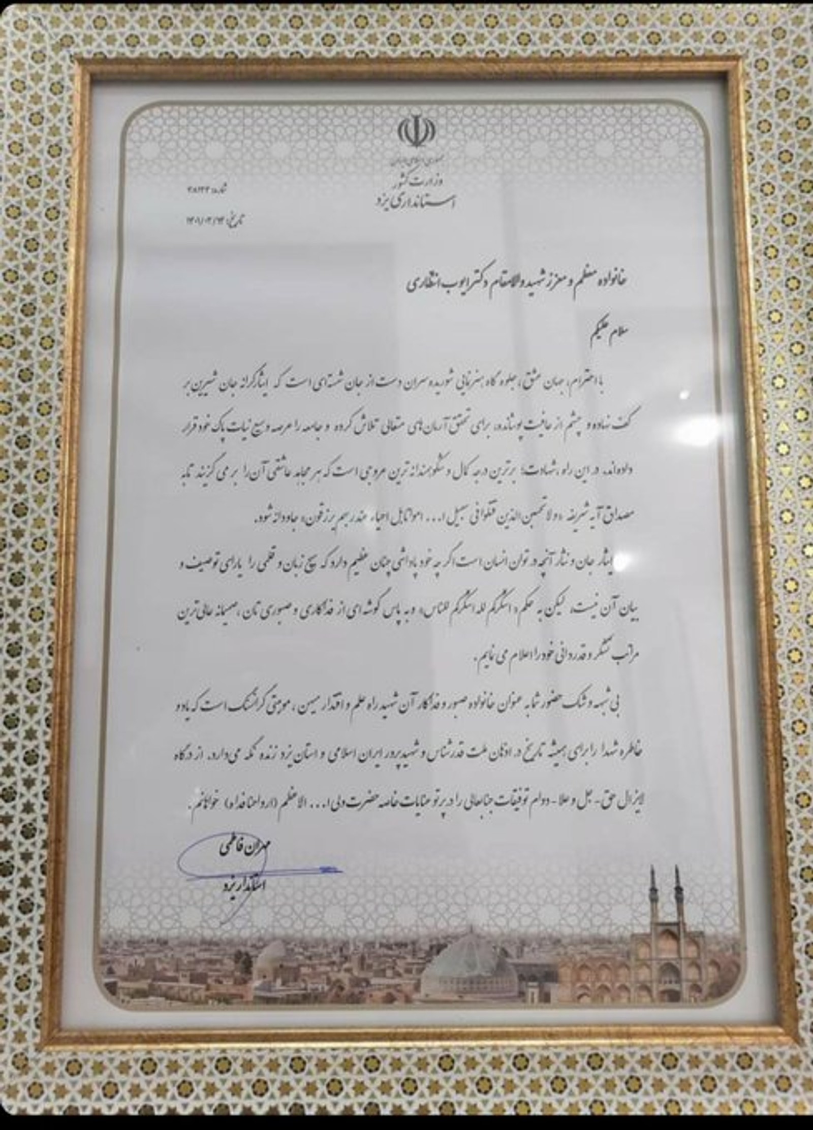 در یک پیام مکتوب از طرف استانداری یزد خطاب به خانواده انتظاری که به امضای استاندار هم رسیده از عبارت «‌شهید» برای ایوب انتظاری استفاده شده است. تصویری هم از حضور مقام‌های محلی در خانه‌ این متخصص پهپادی و موشکی منتشر شده است.