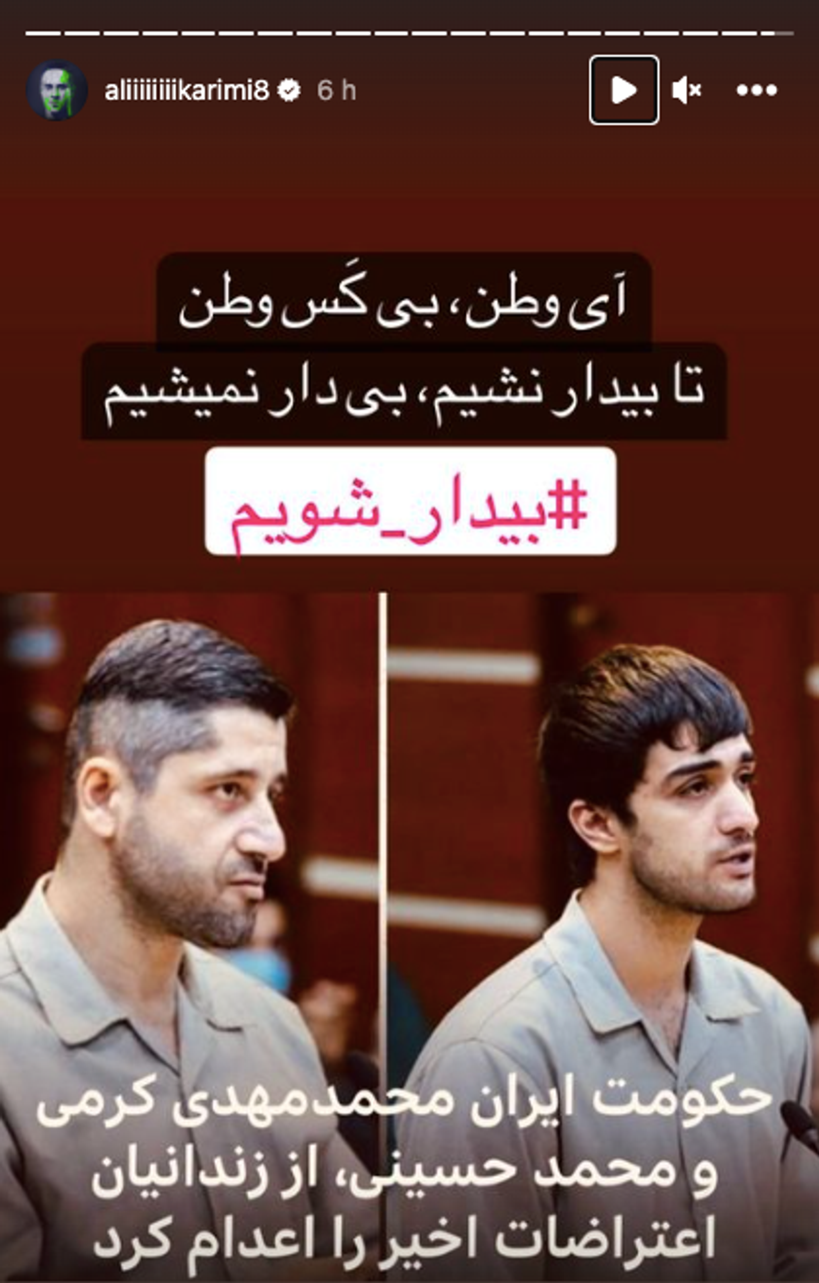علی کریمی، فوتبالیست صاحبنام ایرانی که به جمع مخالفان جمهوری اسلامی پیوسته است نیز در یک استوری در اینستاگرام خود به اعدام دو جوان در ایران واکنش نشان داده و نوشته است: «آی وطن، بیکس وطن، تا بیدار نشیم، بیدار نمیشیم.»