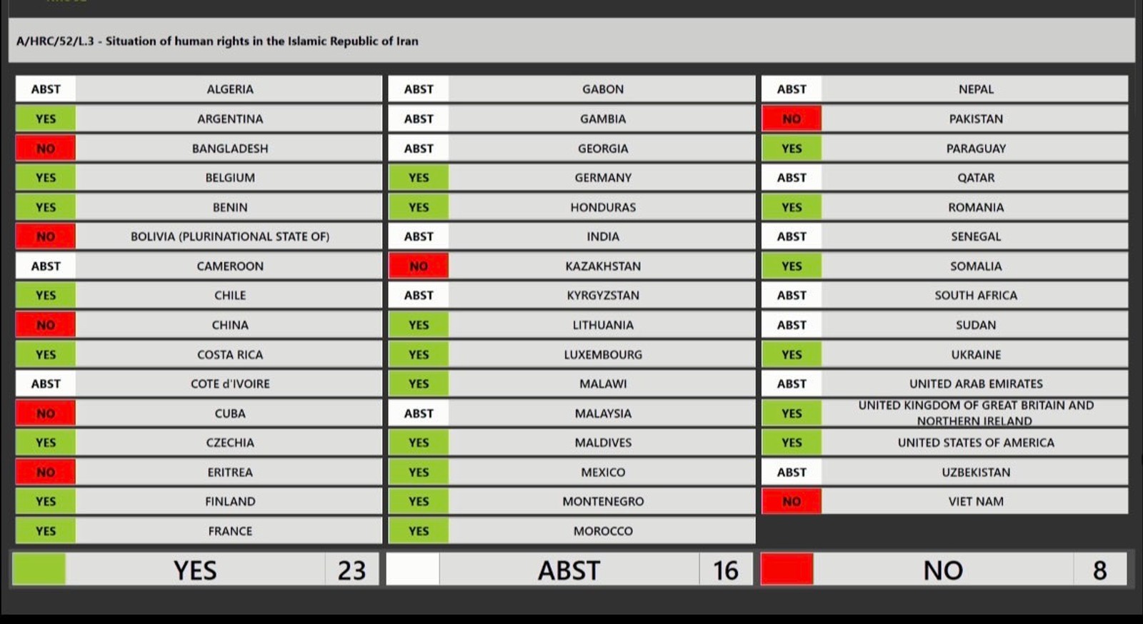 این قطعنامه روز سه‌شنبه ۱۵ فروردین با رای مثبت ۲۳ کشور عضو از ۴۷ عضو شورای حقوق بشر سازمان ملل در ژنو به تصویب رسید.