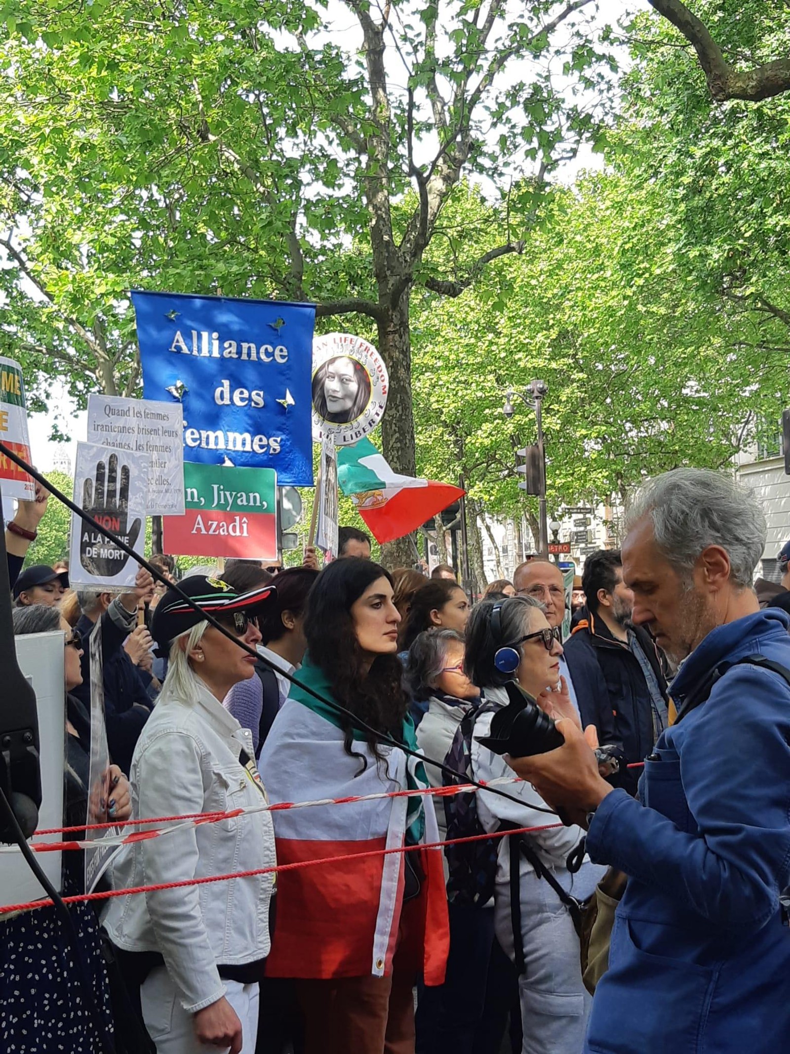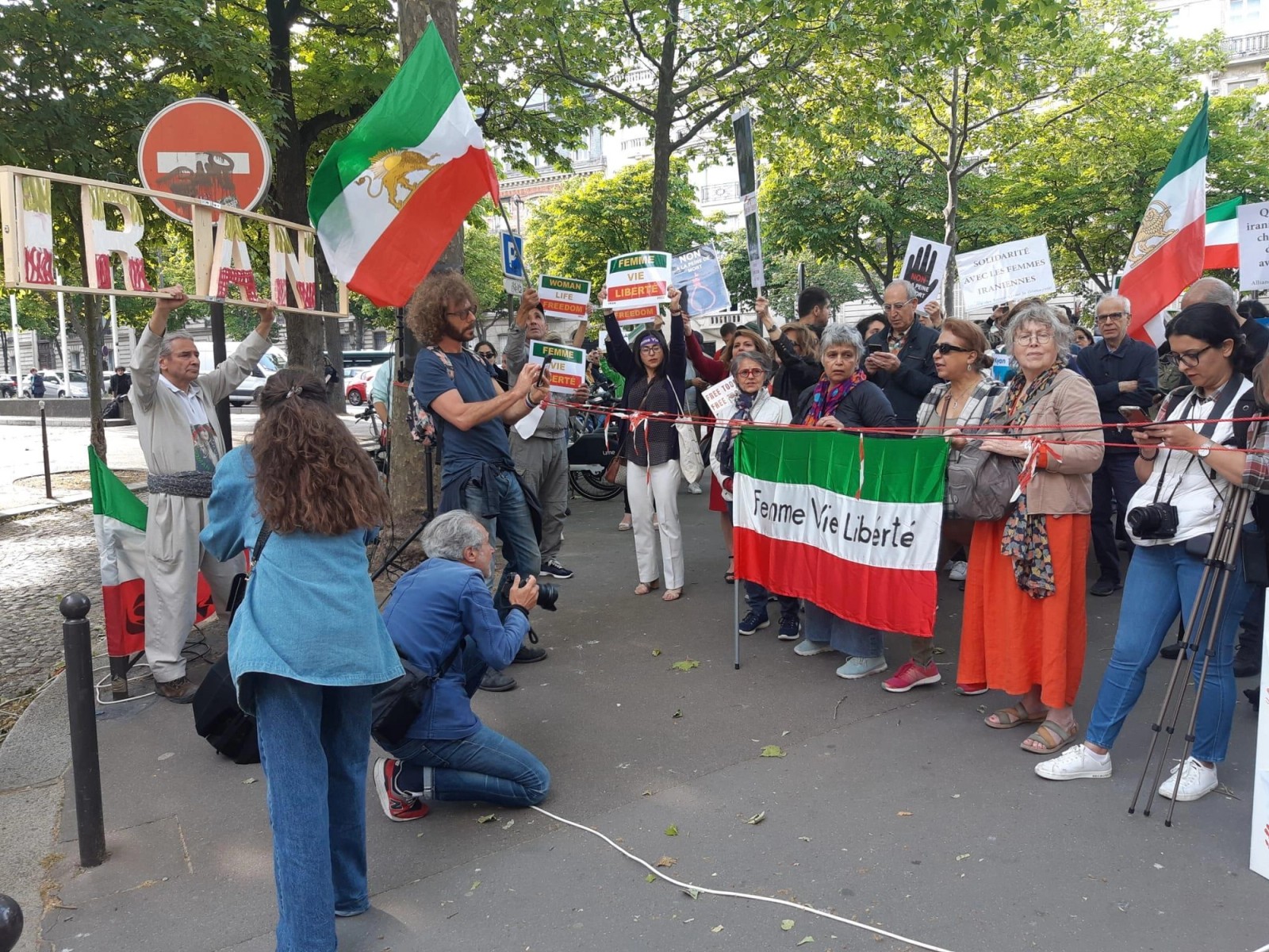 این تجمع روز سه‌شنبه دوم خرداد در فاصله چند ۱۰ متری ساختمان سفارت جمهوری اسلامی در پاریس برگزار شد و تظاهرکنندگان تصاویر ژینا (مهسا) امینی و همچنین مجید کاظمی، صالح میرهاشمی و سعید یعقوبی، سه معترض اعدام‌شده پرونده «خانه اصفهان» را در دست داشتند.