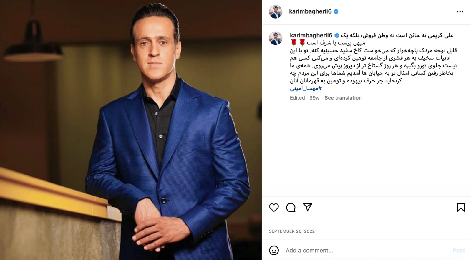 او همچنین در هفته نخست اعتراضات در حمایت از علی کریمی و خطاب به حسن عباسی نوشت: «علی کریمی نه خائن است نه وطن فروش، بلکه یک میهن‌پرست باشرف است. قابل توجه مردک پاچه‌خوار که می‌خواست کاخ سفید را حسینیه کند. تو با این ادبیات سخیف به هر قشری از جامعه توهین کرده‌ای و می‌کنی. کسی هم نیست جلوی تو را بگیرد و هر روز گستاخ‌تر از دیروز پیش می‌روی. همه‌ ما به‌خاطر رفتن کسانی امثال تو به خیابان‌ها آمدیم. شماها برای این مردم چه کرده‌اید جز حرف بیهوده و توهین به قهرمانان آنان؟»