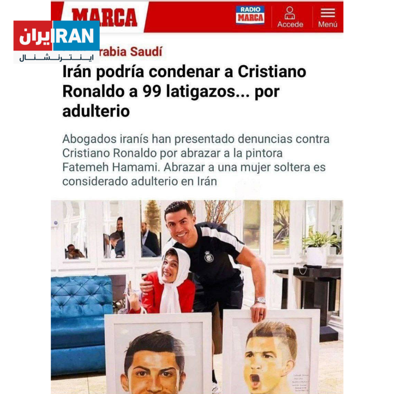 مارکا نوشته: وکلای ایرانی از کریستیانو رونالدو به دلیل در آغوش گرفتن فاطمه حمامی شکایت کردند. بغل کردن زن مجرد در ایران غیرقانونی است.
