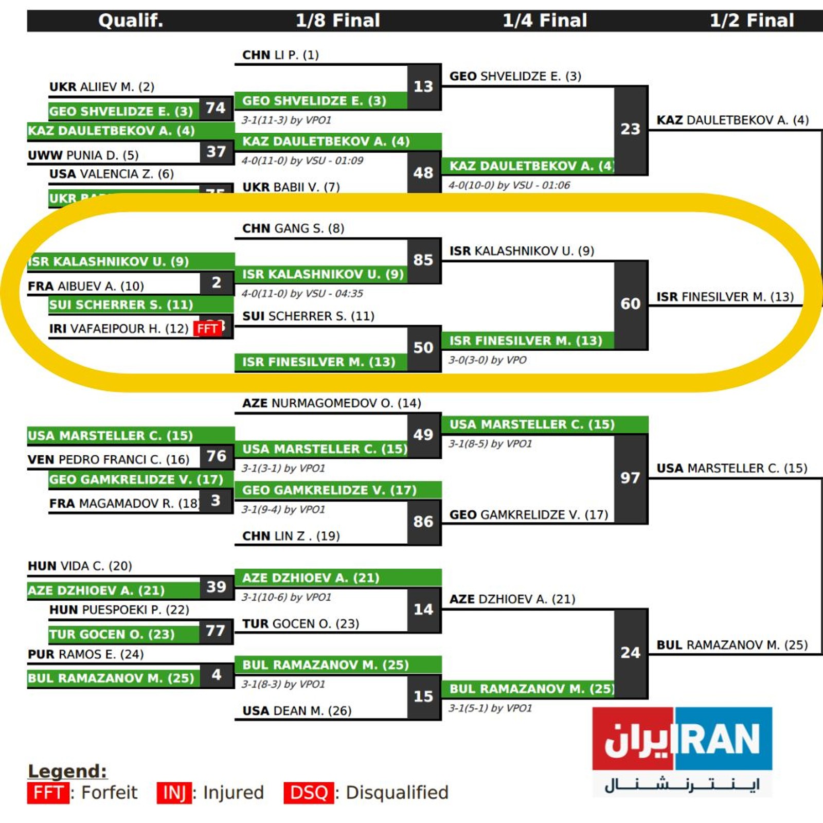 هادی وفاییپور، ملیپوش وزن ۸۶ کیلوگرم کشتی ایران در مسابقات کشتی زاگرب، اولین مرحله از رنکینگ اتحادیه جهانی کشتی در سال ۲۰۲۴، به دلیل حضور یوری کالاشنیکوف و متئو فاینسیلور، کشتیگیران اسرائیل در جدول، با بهانه نرسیدن به وزن، از دور مسابقات کنار رفت.
