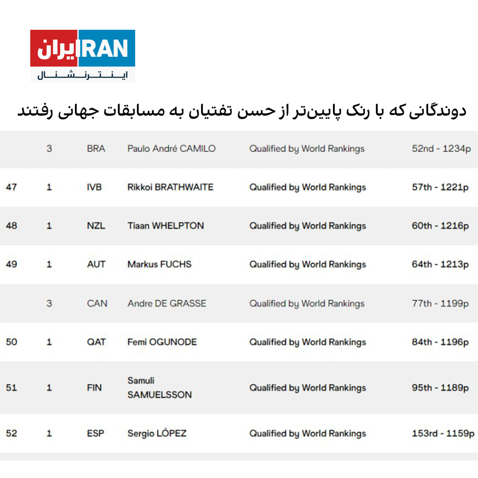 همچنین ۶ دوندهای که با سهمیه رنکنیگ در مسابقات جهانی گلاسکو حاضر هستند، در رتبههای پایین تر از تفتیان قرار داشتند.