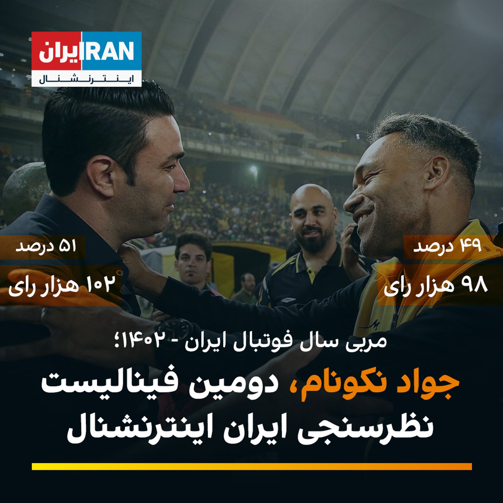 جواد نکونام، سرمربی استقلال، با رای مخاطبان ایران اینترنشنال در رقابت با ژوزه مورایس، سرمربی سپاهان به عنوان دومین فینالیست نظرسنجی مربی سال ۱۴۰۲ ایران شناخته شد.