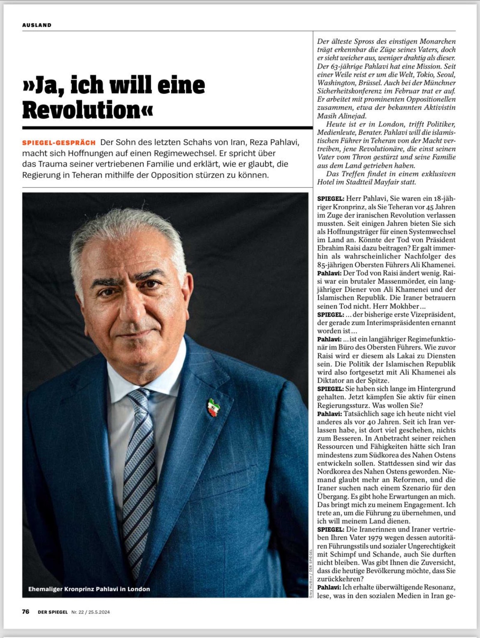 شاهزاده رضا پهلوی در گفتوگو با نشریه آلمانی اشپیگل با اشاره به خیزشهای اخیر در ایران علیه جمهوری اسلامی گفت خواهان انقلاب است و مردم ایران میدانند که اگر «از شر این رژیم خلاص نشویم، کشور محکوم به فناست».