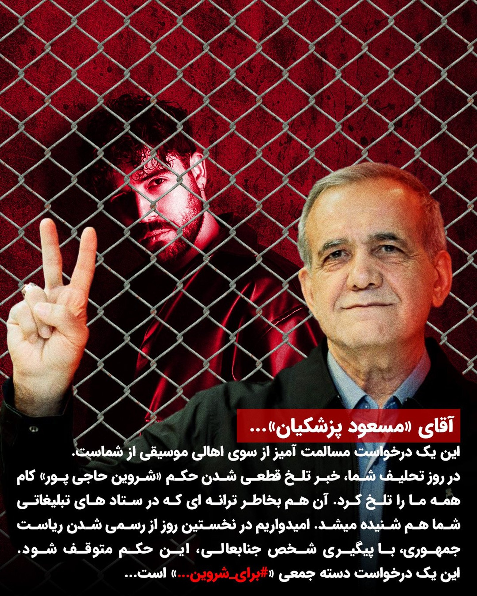 در این درخواست آمده است: «در روز تحلیف شما، خبر تلخ قطعی‌شدن حکم شروین حاجی‌پور کام همه ما را تلخ کرد، آن هم به‌خاطر ترانه‌ای که در ستادهای انتخاباتی شما شنیده می‌شد. امیدوارم در نخستین روز از رسمی شدن ریاست‌جمهوری، با پیگیری شخص جنابعالی این حکم متوقف شود.»