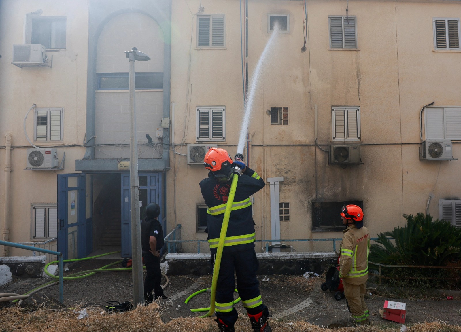 آتشنشانان در تلاش برای فرونشاندن حریق در پی حمله حزبالله به کیریات شمونا در شمال اسرائیل، ۱۸ مهر