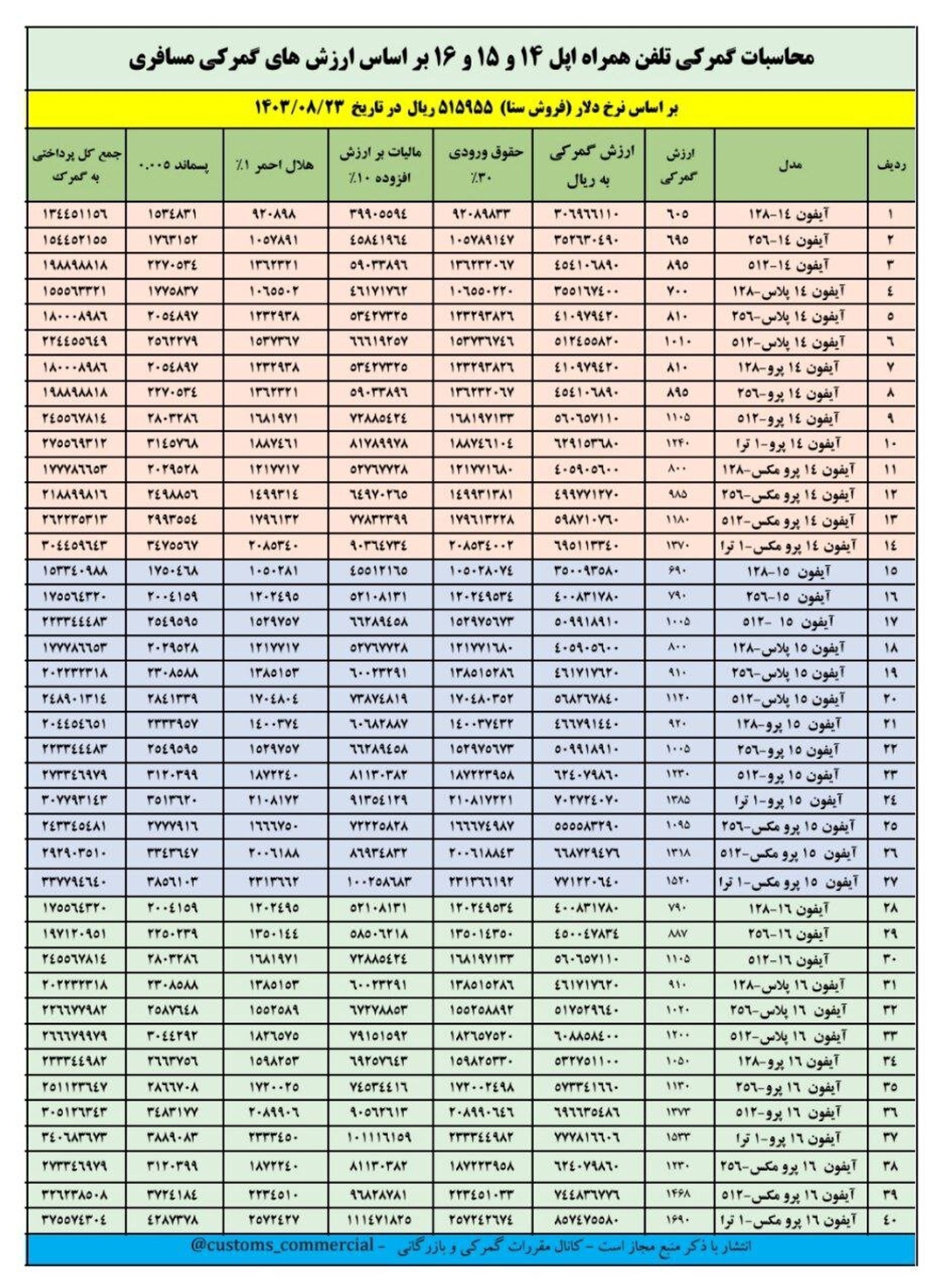 جدول منتشر شده نشان میدهد حقوق ورودی و مالیات برای انواع این گوشیها حدود ۴۱ درصد است که به طور پلکانی نسبت به ارزش اولیه محاسبه میشود؛ به طوری که در نهایت جمع دریافتی گمرک از هر گوشی، حدود ۴۴ درصد ارزش هر گوشی است.