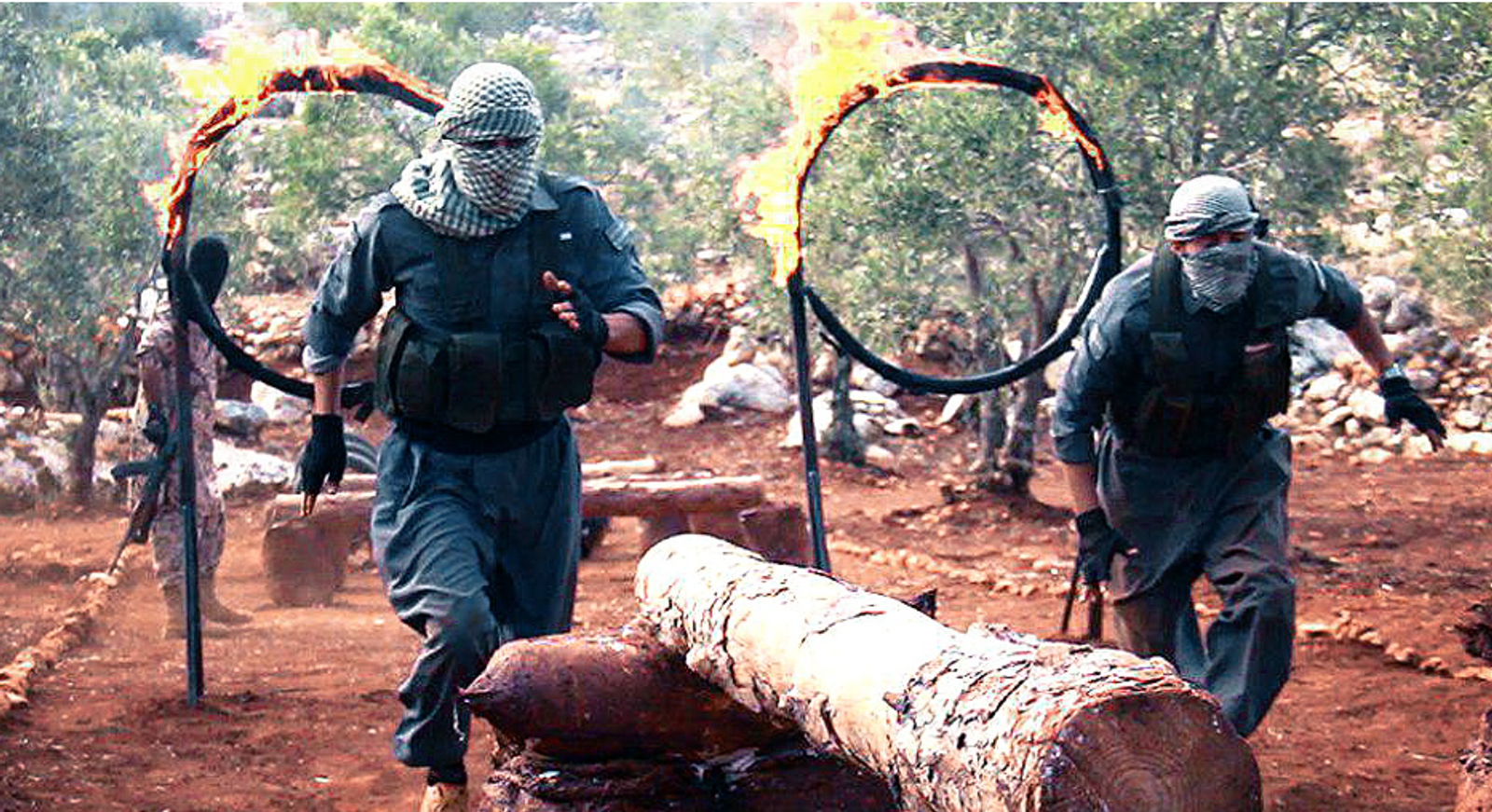 اعضا حرکت مجاهدین اهل سنت ایران که پرچم خود را دست گرفته و پرچم استقلال سوریه را زیر پا گذاشتهاند