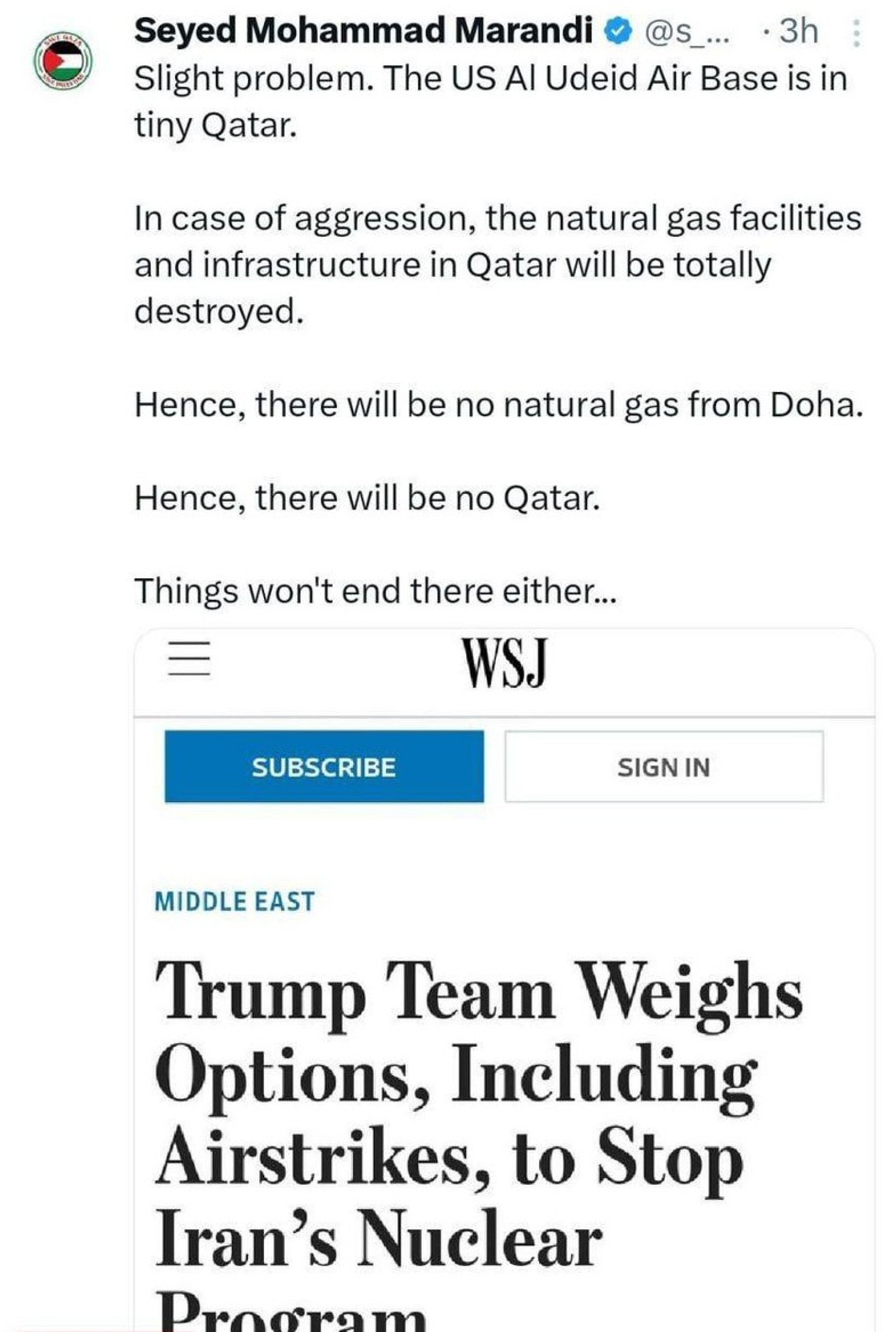 محمد مرندی، مشاور پیشین تیم مذاکرهکننده هستهای تهران در دولت رئیسی، در واکنش به گزارش والاستریت ژورنال درباره اینکه ترامپ در حال بررسی گزینه حمله نظامی به تاسیسات هستهای ایران است، در ایکس پستی تهدیدآمیز را درباره قطر نوشت، اما پس از انتشار و بازتاب آن، پست خود را کرد.