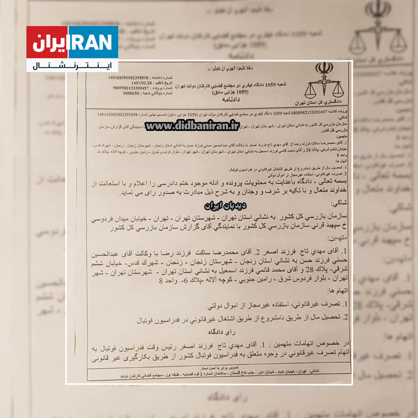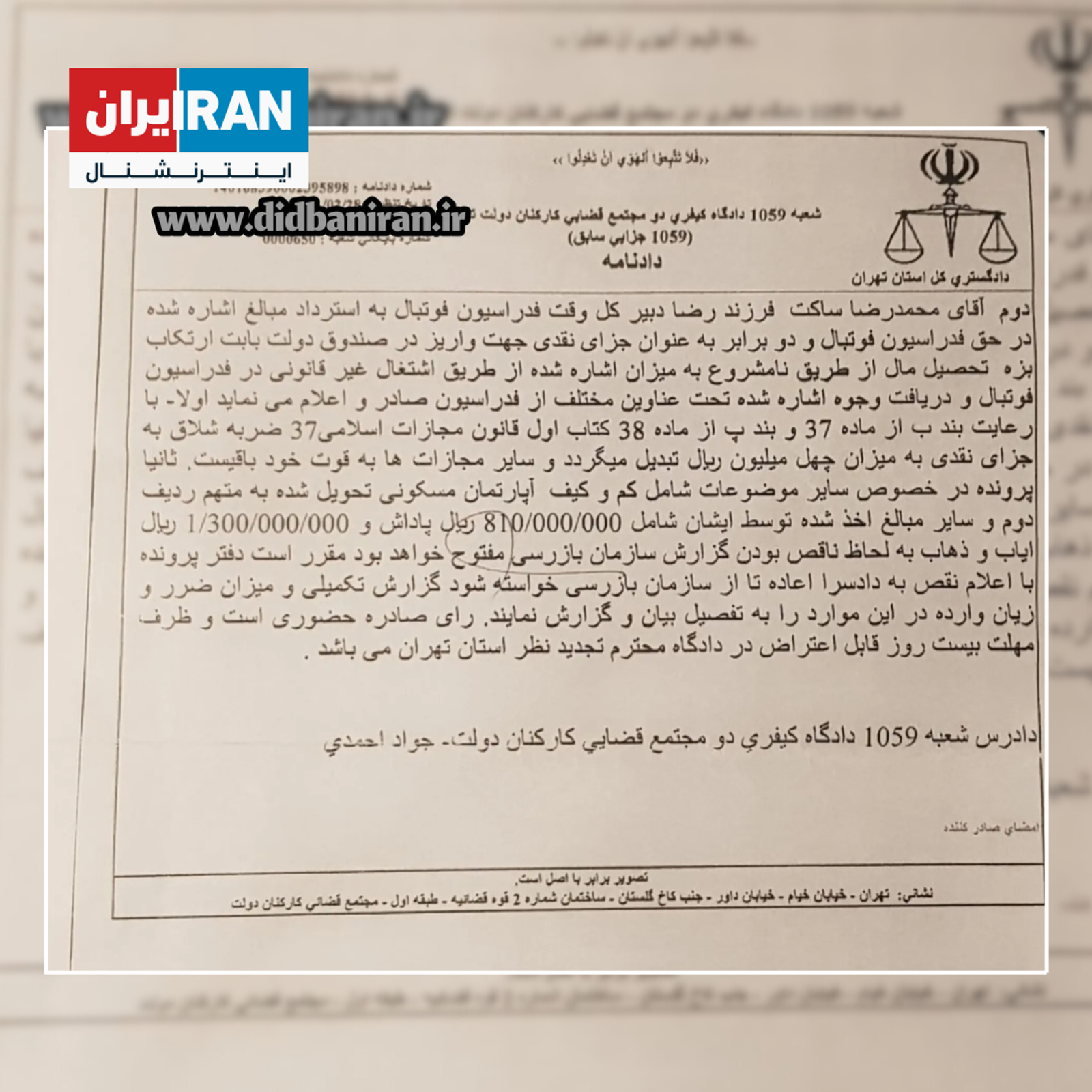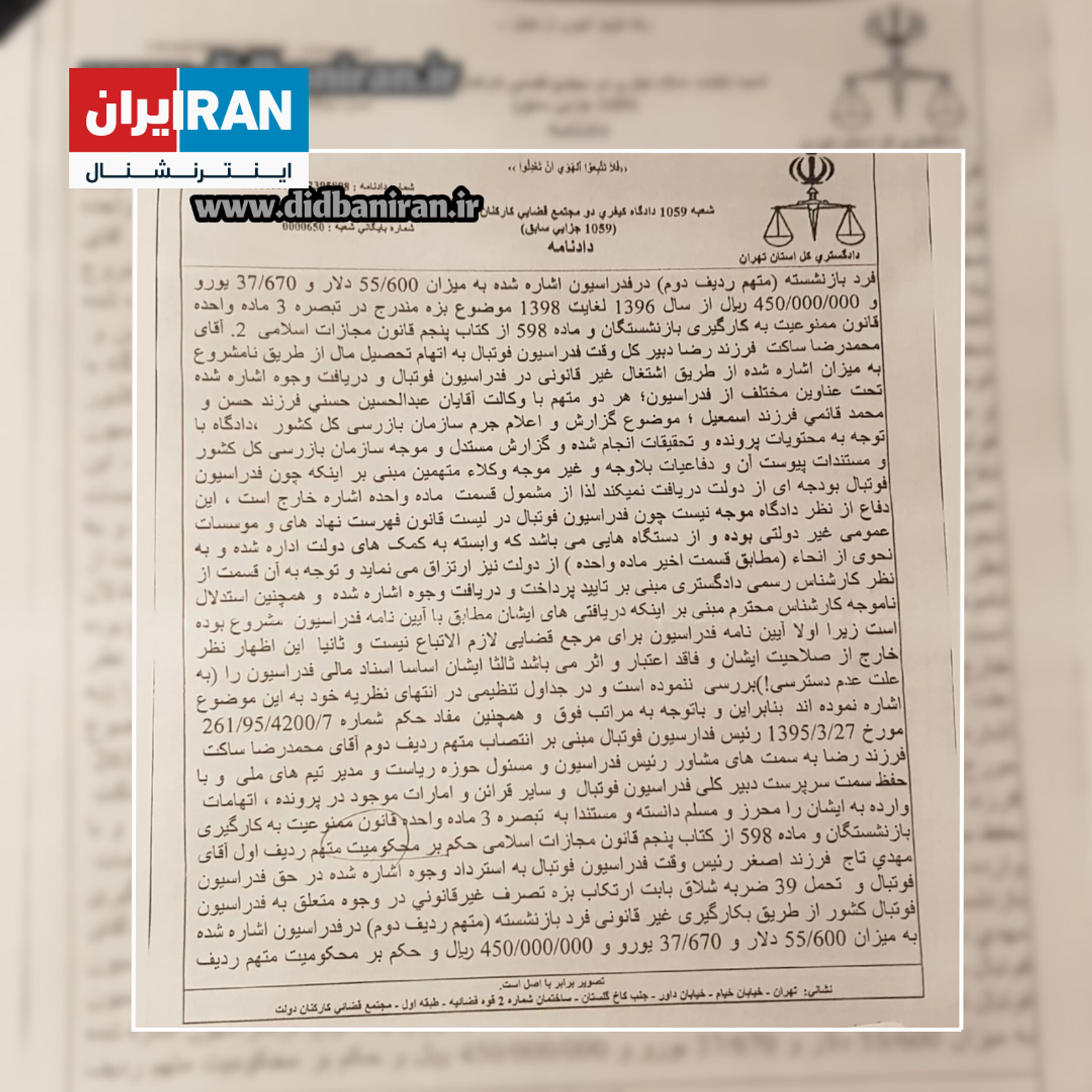 در حکم قضایی برای رئیس فعلی فدراسیون فوتبال آمده است: «مهدی تاج به اتهام تصرف غیرقانونی در وجوه متعلق به فدراسیون فوتبال کشور از طریق به‌کارگیری غیرقانونی افراد بازنشسته (محمدرضا ساکت) به میزان ۵۵۶۰۰ دلار و ۳۷۶۷۰ یورو و ۴۵۰ میلیون ریال از سال ۱۳۹۶ تا ۱۳۹۸ موضوع بزه مندرج در تبصره ۳ ماده واحده قانون منبع به‌کارگیری بازنشستگان و ماده ۵۹۸ از کتاب پنجم قانون مجازات اسلامی به استرداد وجوه اشاره‌شده در حق فدراسیون فوتبال و تحمل ۳۹ ضربه شلاق بابت ارتکاب بزه محکوم می‌گردد.»