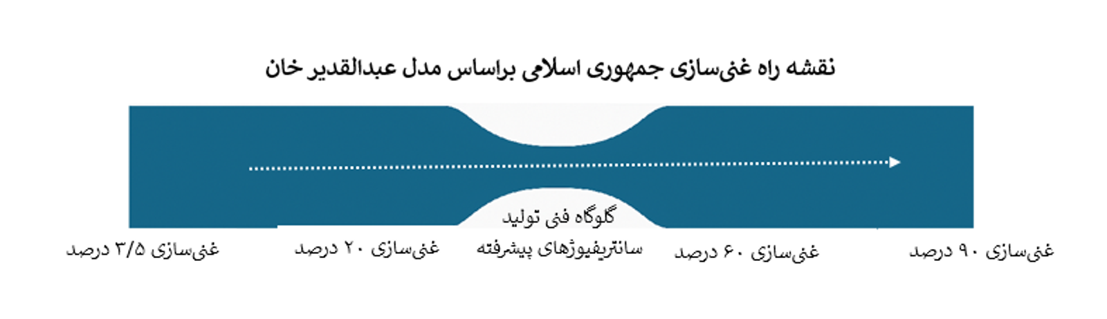 فرایند غنیسازی اورانیوم در جمهوری اسلامی، بر پایه نقشه راهی طراحی شده که از مدل عبدالقدیر خان، پدر برنامه هستهای پاکستان، الهام گرفته است، مسیری پلکانی و مرحله به مرحله که با غنیسازی ۳.۵ درصدی برای مصارف نیروگاهی آغاز شد.
