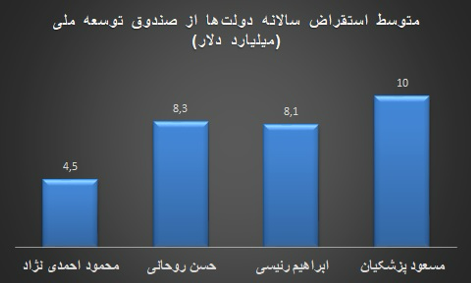 آمارهای مرکز پژوهشهای مجلس نشان میدهند از زمان راهاندازی صندوق توسعه ملی در سال ۲۰۱۱ تا مارس ۲۰۲۴ حدود ۸۲ درصد از درآمد ۱۶۱میلیارد دلاری آن مصرف شده و ۸۸ درصد وامهای ارائه شده نیز سهم دولت و نهادهای عمومی (سپاه پاسداران و غیره) بوده است.