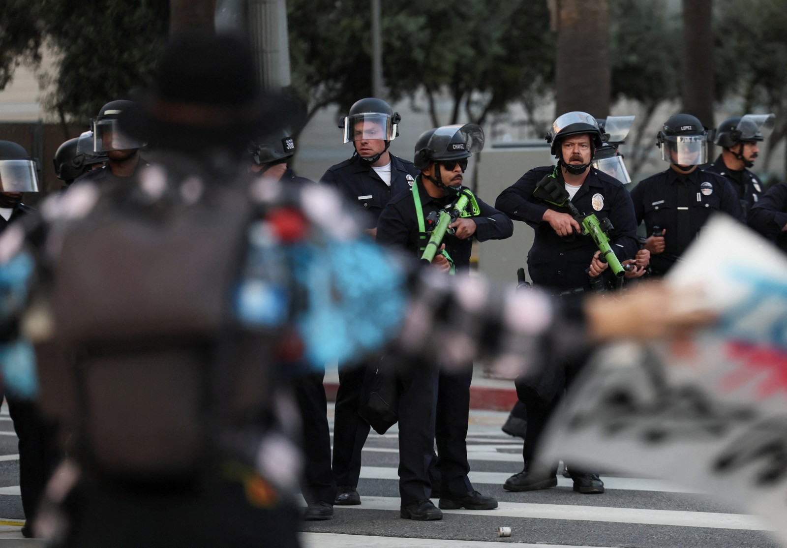 پلیس لس‌آنجلس در یکی از تجمعات نزدیک ساختمان شهرداری اعلام کرد که «اجتماع غیرقانونی» شکل گرفته و مدعی شد برخی معترضان به سوی ماموران بتن، بطری و اشیای دیگر پرتاب کرده‌اند. در بیانیه‌ای در شبکه‌های اجتماعی، پلیس اعلام کرد که «روند بازداشت آغاز شده است.»