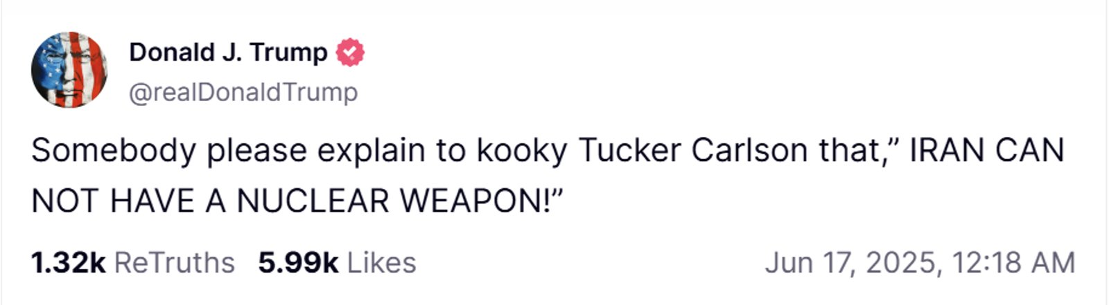 دونالد ترامپ رییس جمهور آمریکا در شبکه اجتماعی خود تروث نوشت: لطفا یک نفر به تاکر کارلسون دیوانه توضیح بدهد که: «ایران نباید سلاح هسته‌ای داشته باشد!».
