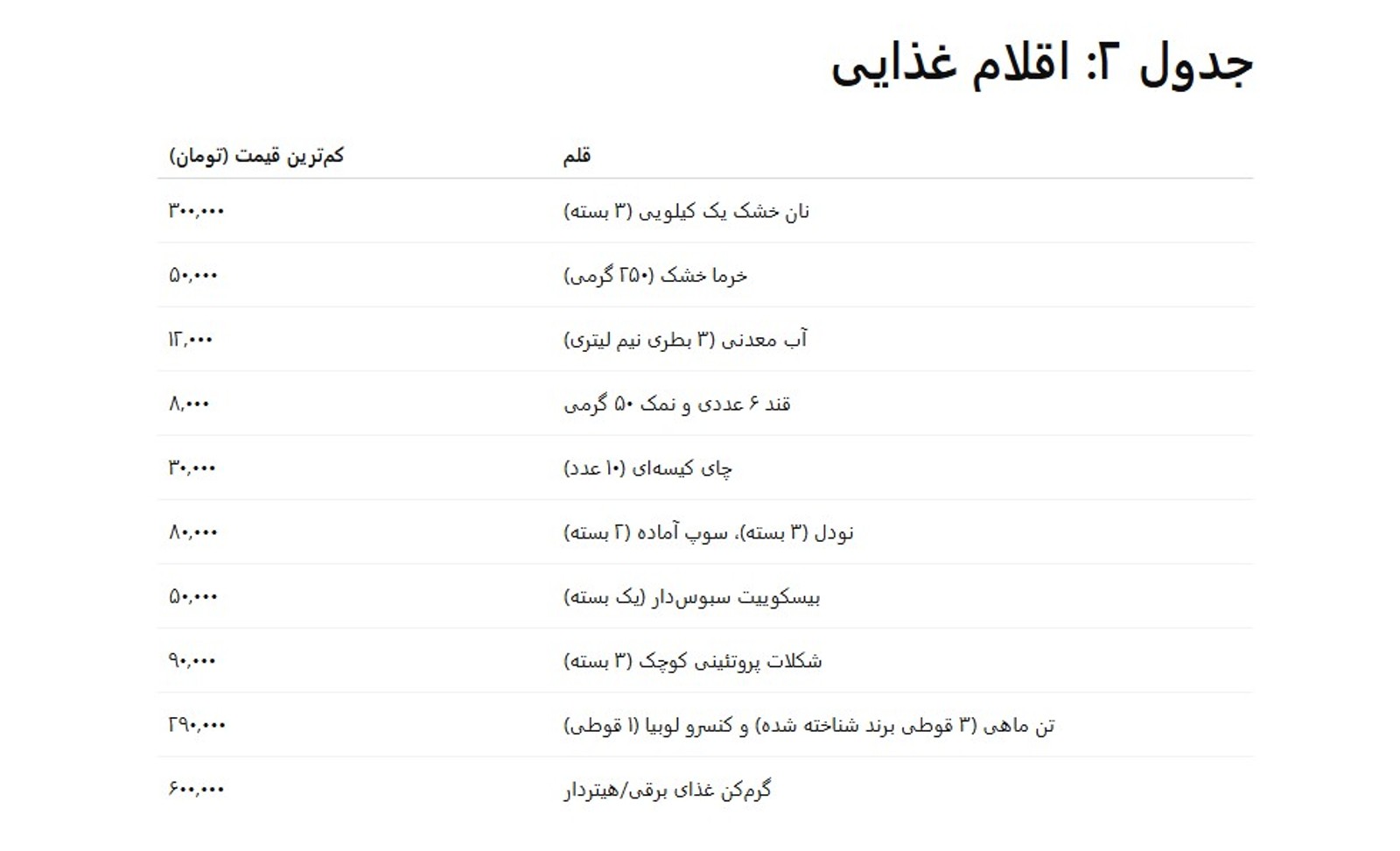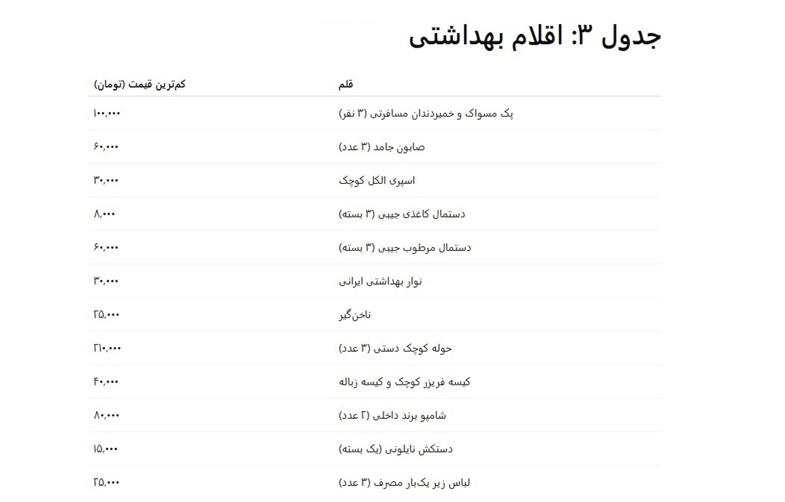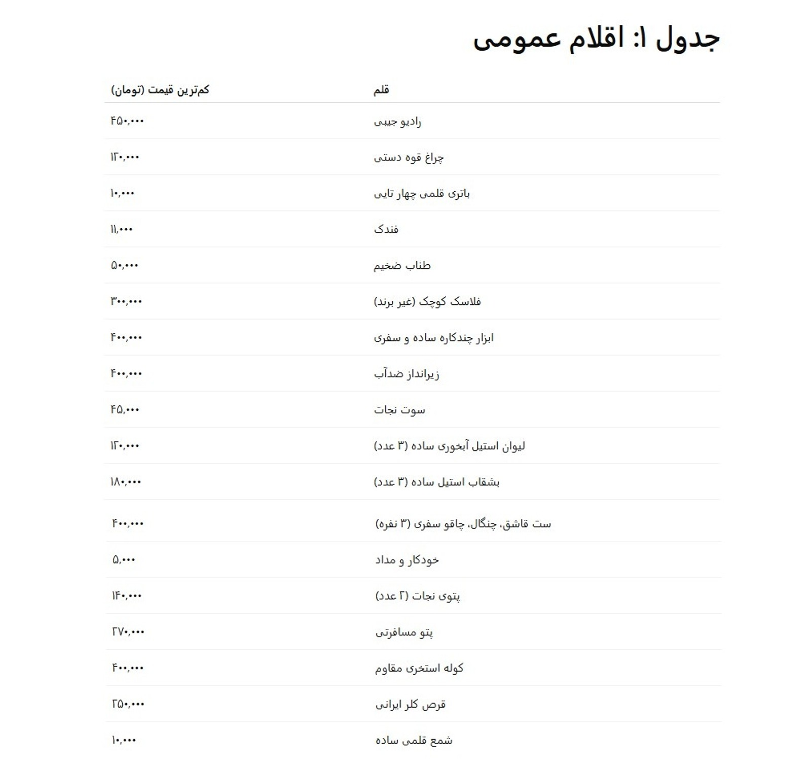 در سایت‌های فروش کالا قیمت‌های مختلفی برای هر قلم به نسبت جنس، برند و فروشنده درج شده که در عمده این موارد،‌ «کم‌ترین» قیمت در نظر گرفته شده است.