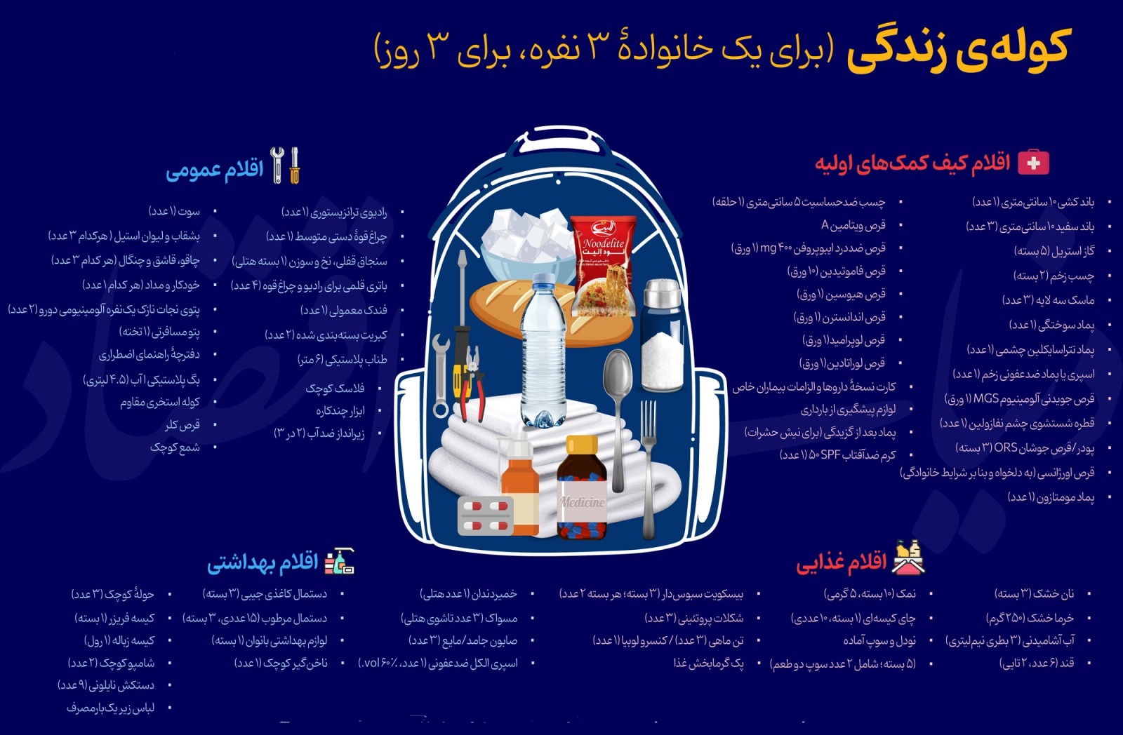 در این بسته حدود ۷۰ قلم کالا شامل مواد خوراکی، بهداشتی، کمک‌های اولیه و وسایل عمومی برای دوام آوردن یک خانواده سه نفره به مدت سه روز در حادثه و بحران در نظر گرفته شده است.