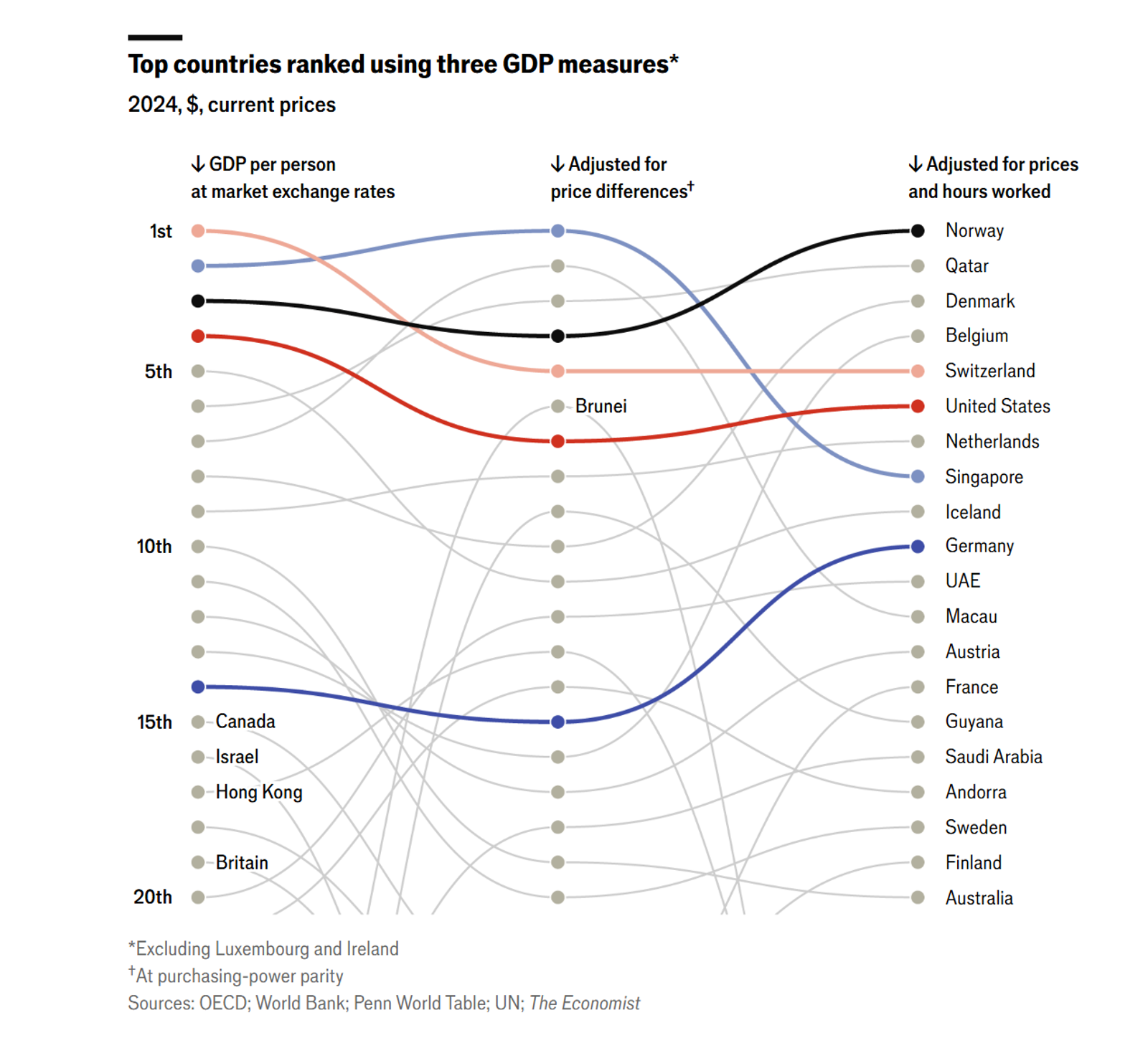 اکونومیست در پایان خاطرنشان میکند که برخی کشورها از این ارزیابی کنار گذاشته شدهاند؛ از جمله ایرلند که بهدلیل حضور گسترده شرکتهای چندملیتی، شاخصهای تولید ناخالص داخلی آن بهدرستی بازتابدهنده رفاه واقعی نیستند، و لوکزامبورگ که درآمدهای آن از حضور کارگران مرزی کشورهای همسایه متاثر شده است. همچنین مناطقی مانند برمودا نیز بهدلیل جمعیت اندک، در این رتبهبندی نیامدهاند.
