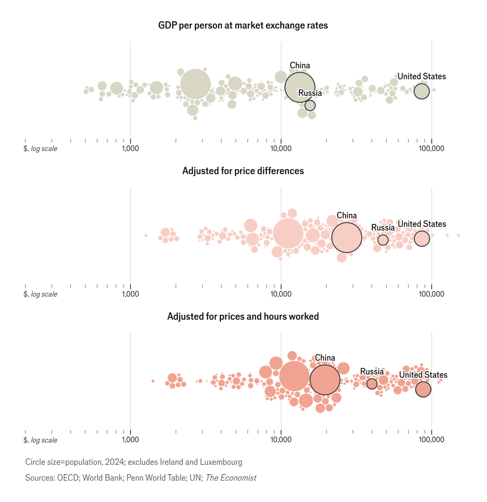 اکونومیست در این ارزیابی از سه معیار کلیدی استفاده کرده است: تولید ناخالص داخلی (جیدیپی)، سرانه بر پایه نرخ ارز رسمی، جیدیپی سرانه تعدیلشده بر اساس برابری قدرت خرید (پیپیپی)، و در نهایت شاخصی ترکیبی که افزون بر قیمتها، ساعات کار را نیز در نظر میگیرد.