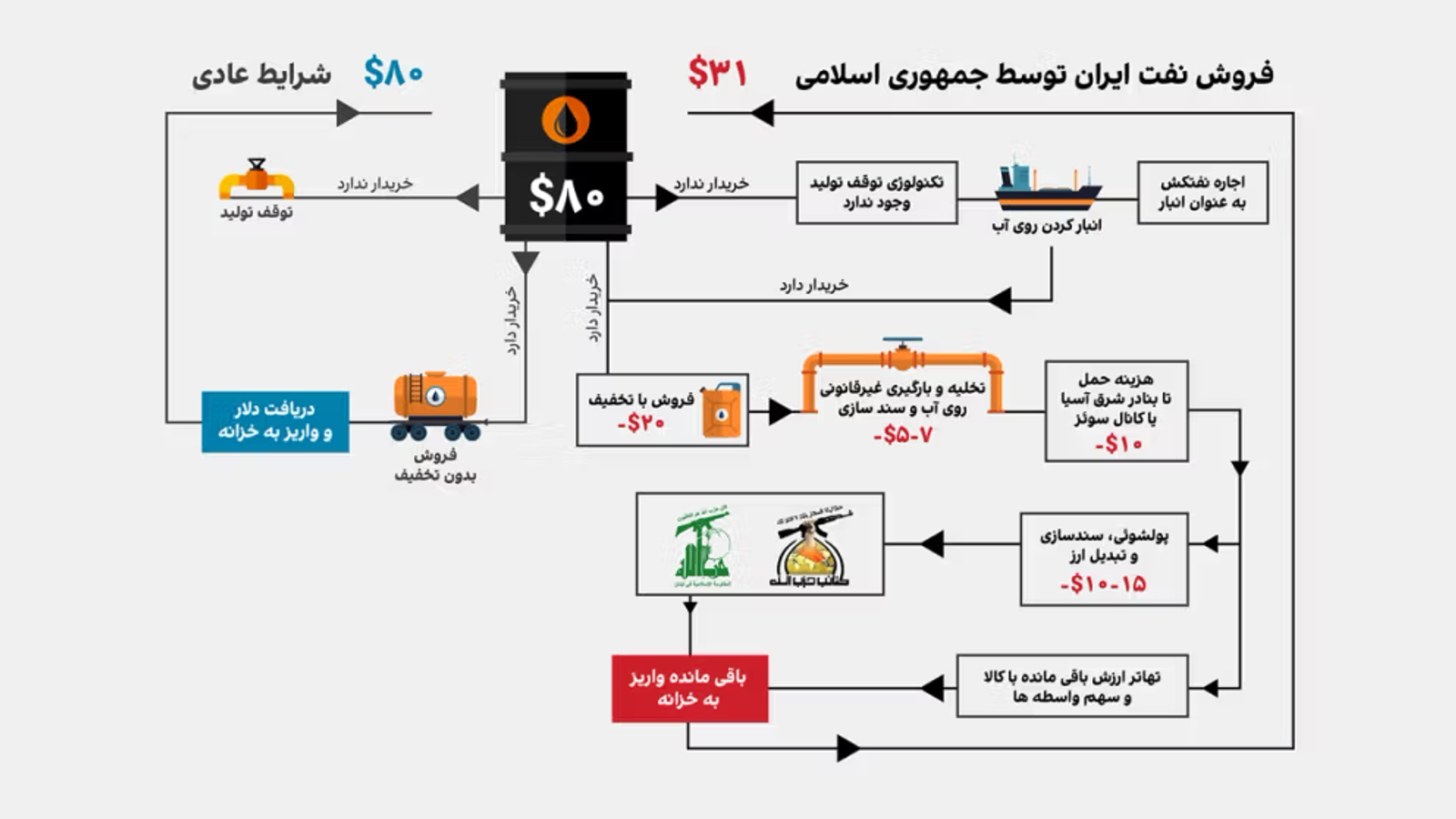 بیشتر این نفتکش‌های معطل، در آب‌های سنگاپور و مالزی - مراکز اصلی عملیات انتقال کشتی به کشتی ایران - شناورند. نگهداری این حجم از نفت روی دریا، هزینه‌های سنگینی به جمهوری اسلامی تحمیل می‌کند.