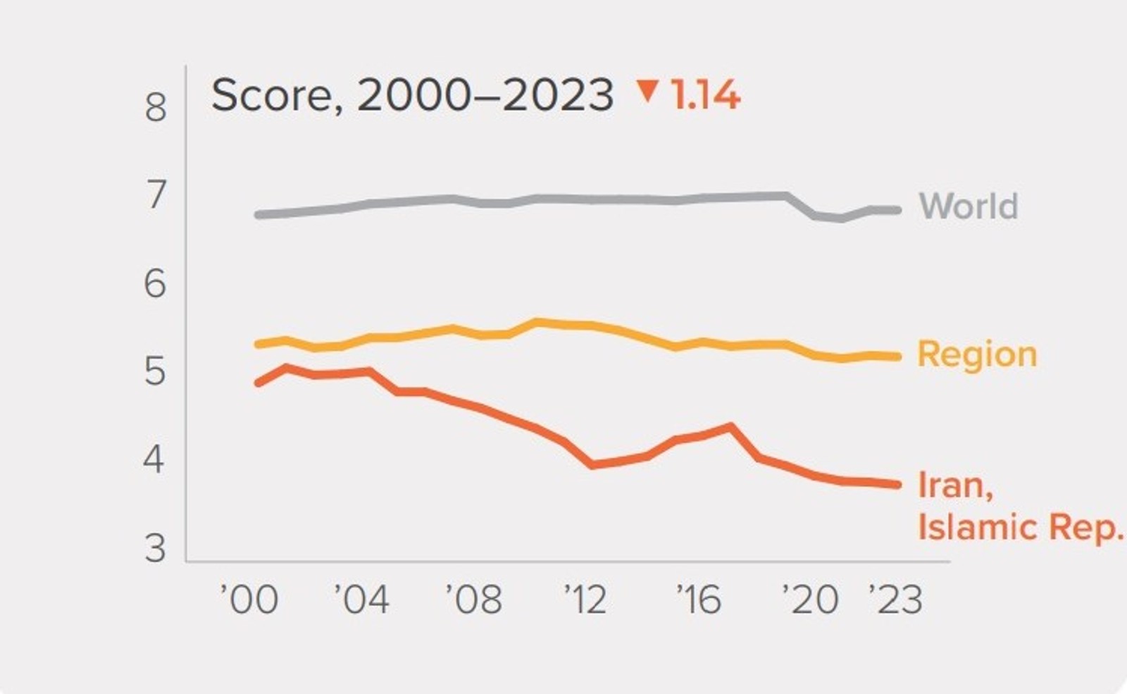 نکته قابل توجه این است که خط سیر جمهوری اسلامی در این جدول از خط سیر میانگین کشورهای منطقه نیز پایینتر است.