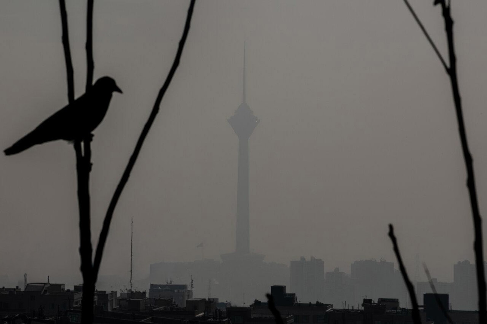 نمایی از برج میلاد در میان مه غلیظ ناشی از آلودگی هوا، تهران، نوامبر ۲۰۲۵