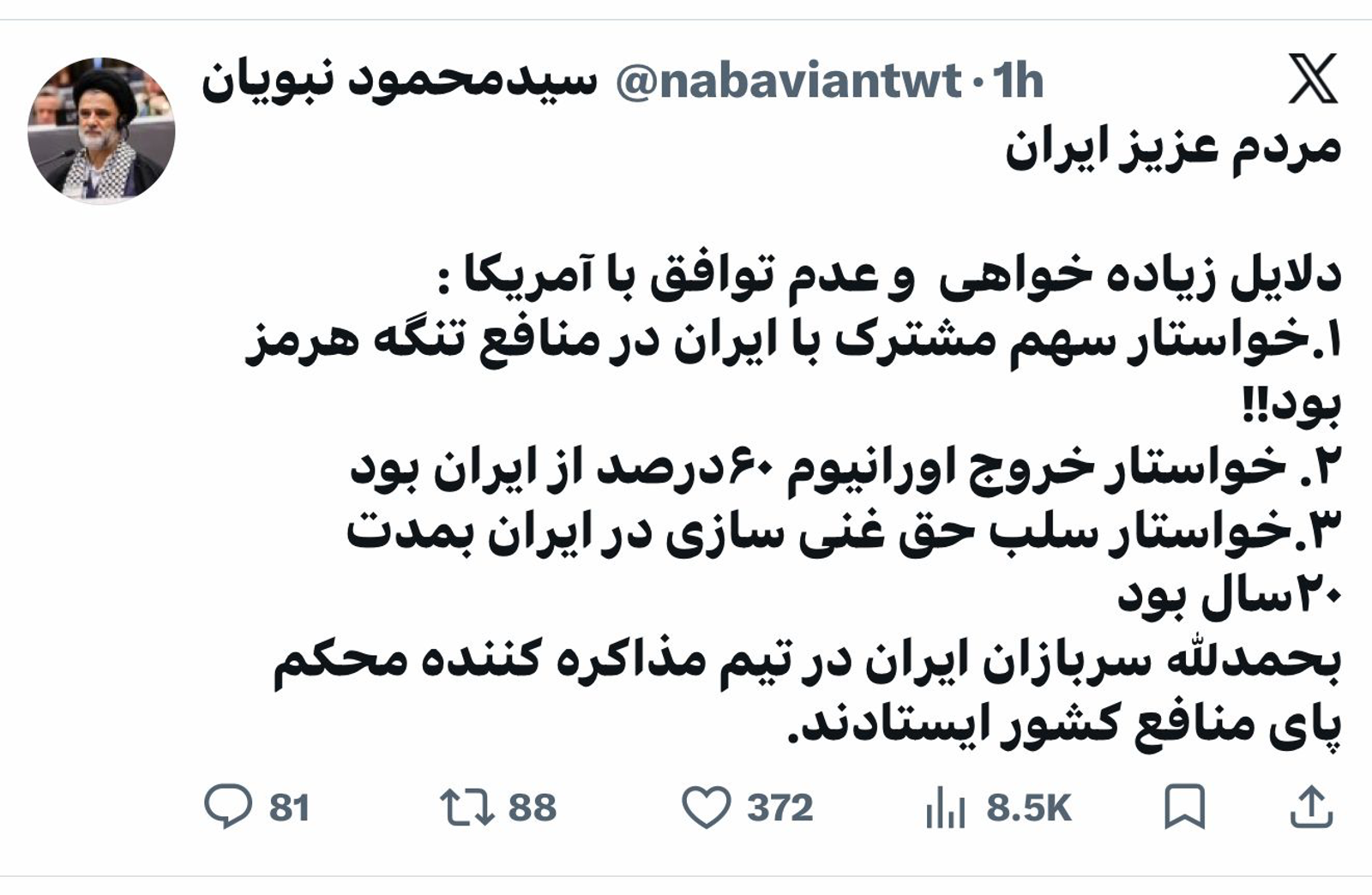 محمود نبویان، نماینده مجلس و از اعضای هیات اعزامی جمهوری اسلامی به پاکستان، پیام خود درباره خواستههای آمریکا در مذاکرات اسلامآباد را که در شبکه ایکس نوشته بود، حذف کرد.